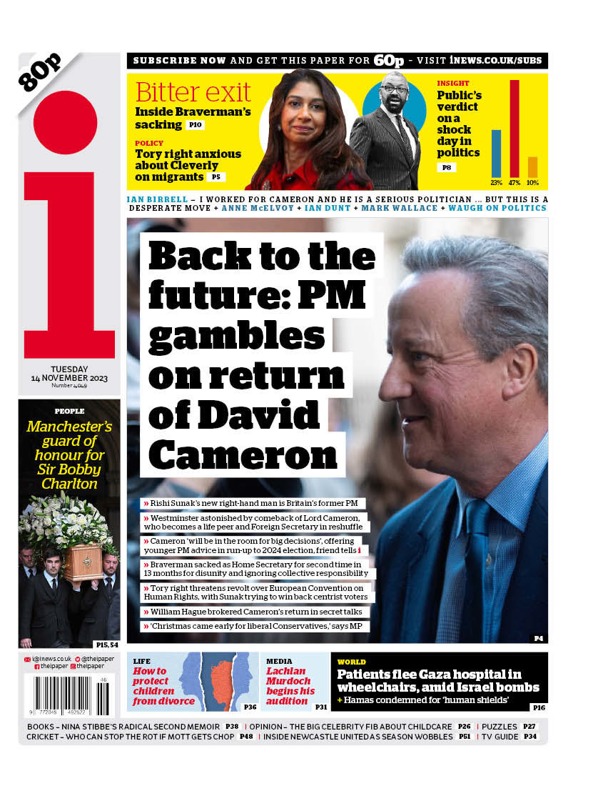 The i paper covers David Cameron’s return to politics as UK’s foreign secretary.