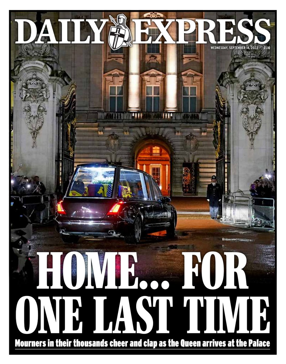 An image of the Queen’s coffin entering Buckingham Palace appears on the front page of the Daily Express with the headline “Home… For one last time.”.