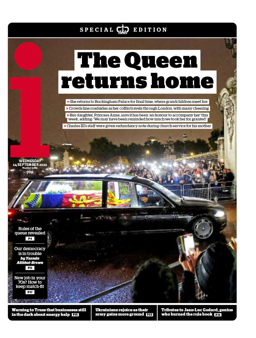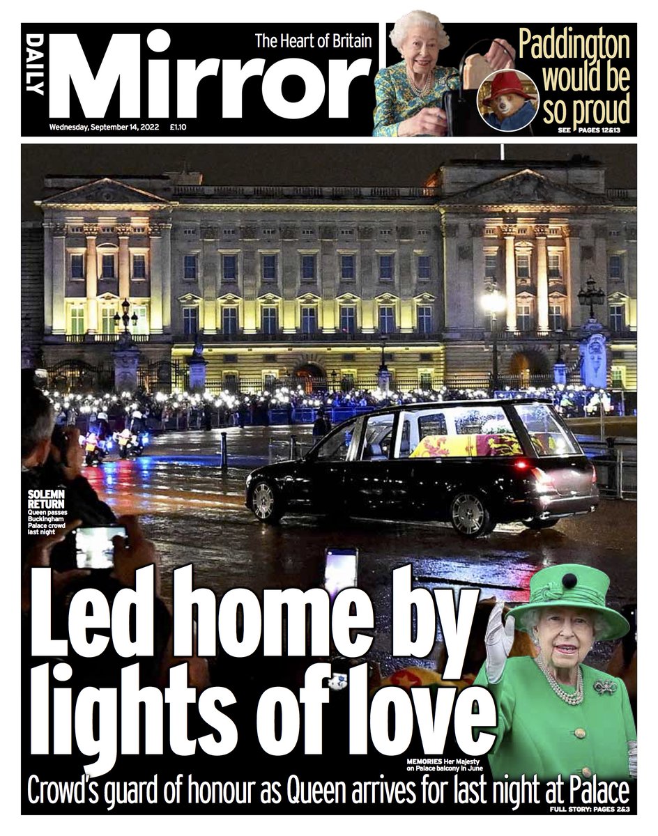 Featured on the front of the paper is a photograph of the late monarch’s coffin being driven through the gates of Buckingham Palace.