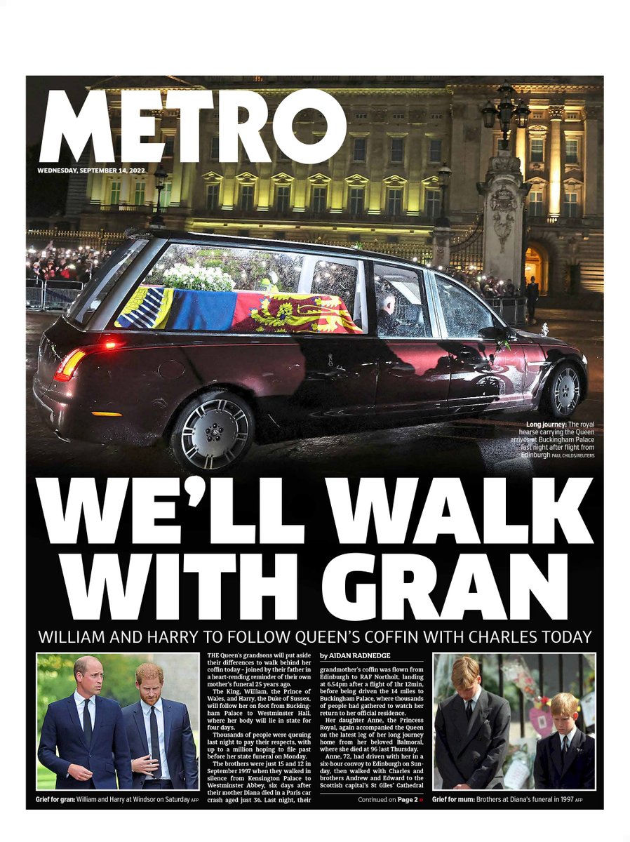 The Metro reports that Prince William and Prince Harry will walk behind the Queen’s coffin on Wednesday along with King Charles.