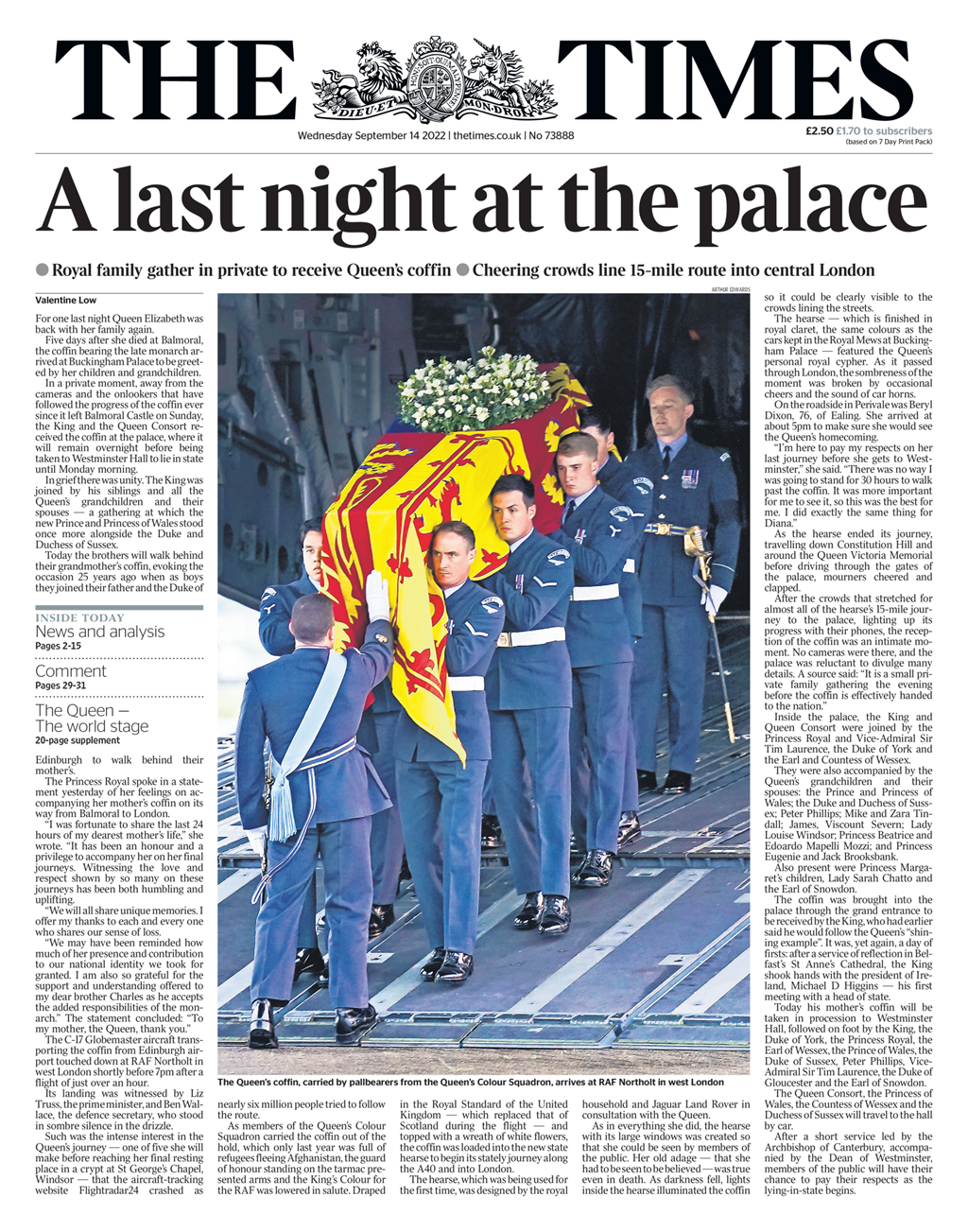 A poignant photograph from The Times shows the Queen’s coffin being carried off the aircraft that carried her from Scotland to RAF Northolt.
