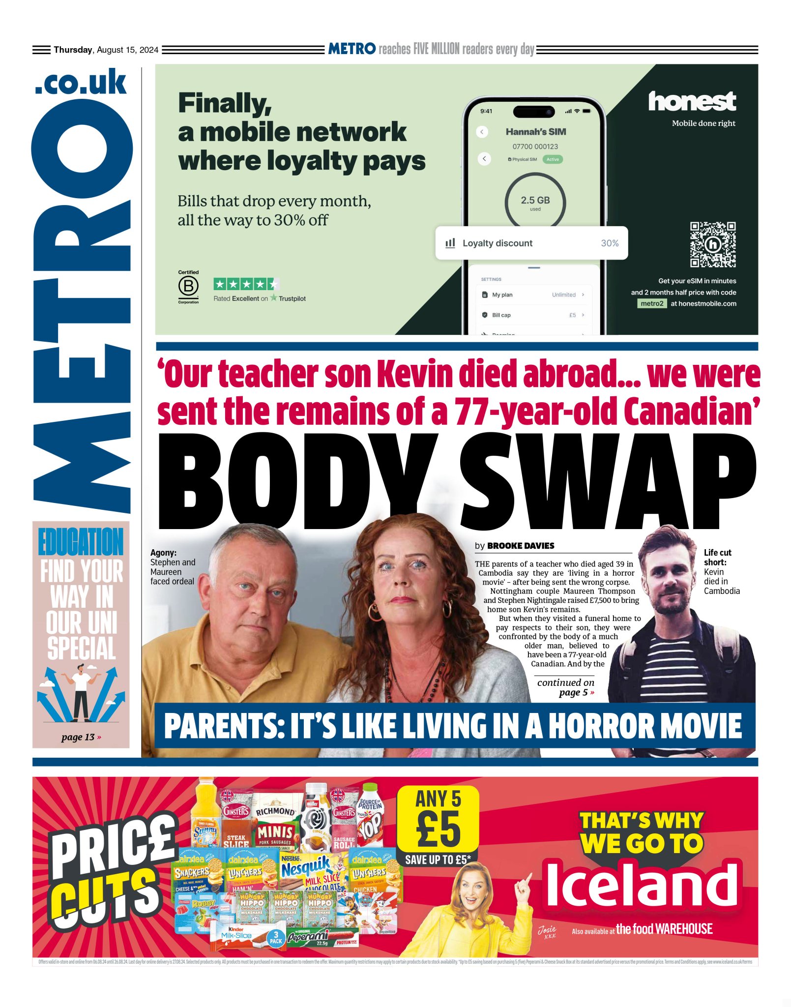 The parents of a Nottingham teacher who died abroad were sent the remains of a 77-year-old Canadian instead of their son, causing them significant distress and confusion.