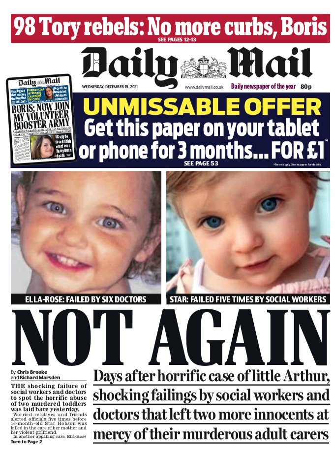 The Daily Mail leads with what it’s calling the “shocking failure” of social workers and doctors following the deaths of Ella-Rose Clover and Star Hobson.