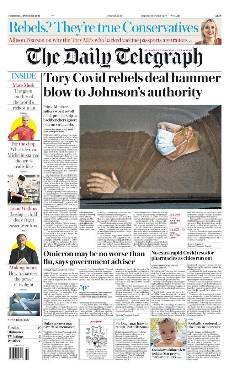 Almost half of Boris Johnson’s backbenchers voted against vaccine passports, The Daily Telegraph says, giving the prime minister the “worst parliamentary rebellion of his premiership”.