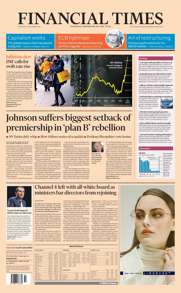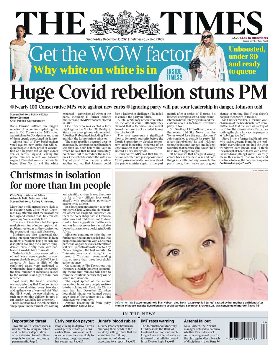The Financial Times leads with what it calls a “crushing blow” to Boris Johnson’s authority after almost 100 Tory MPs voted against vaccine passports.