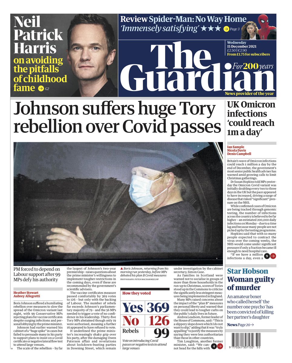 The Guardian says a big Tory rebellion over vaccine passports underlines the prime minister’s “increasingly shaky grip over his party”.