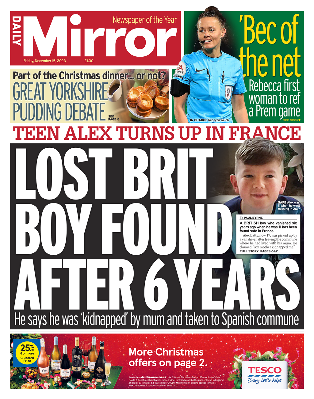 The Daily Mail’s front page highlights the discovery of Alex Batty, six years post his alleged abduction by his mother.