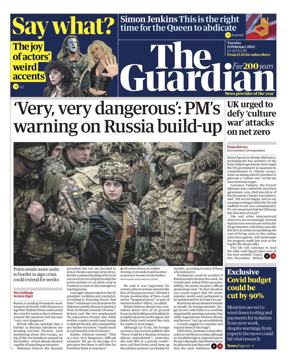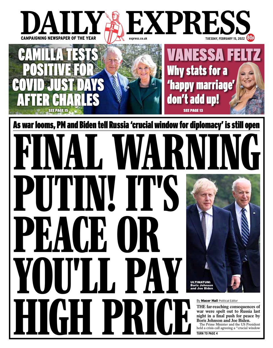 The Daily Express also leads on tensions between Russia and Ukraine, with Western leaders issuing a final warning to Vladimir Putin.