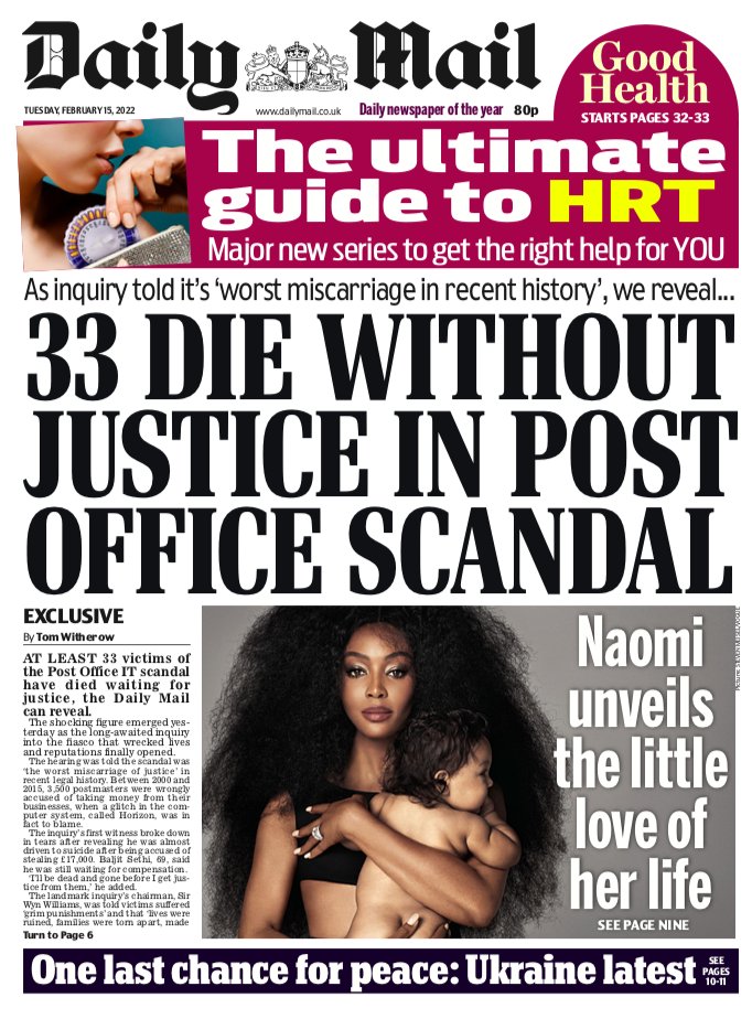 At least 33 people died waiting for justice in the Post Office IT scandal, the Daily Mail writes.