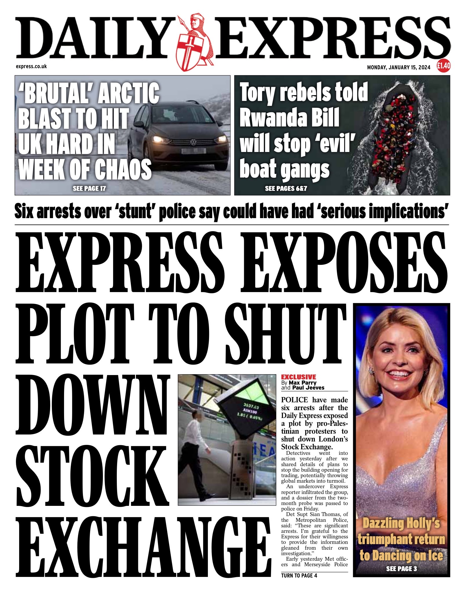 The Daily Express reports on the arrest of six individuals linked to a plot against the London Stock Exchange.