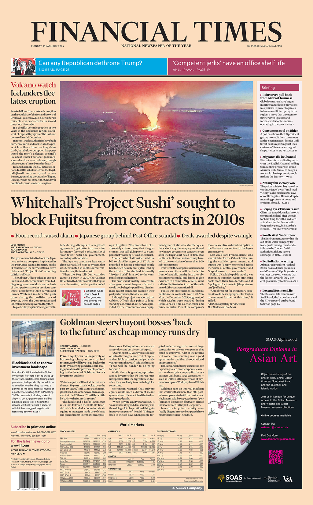 The Financial Times reports on the government’s attempt to bar Fujitsu, implicated in the Post Office scandal, from new public contracts in the early 2010s.