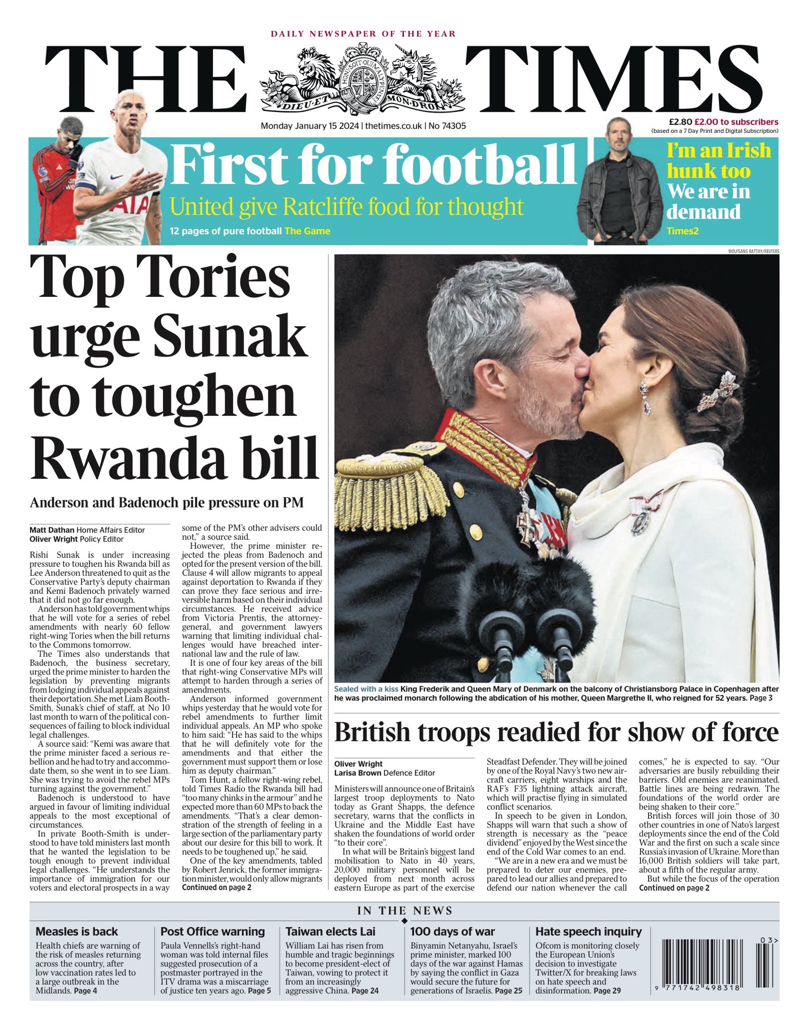 The Times reports that the prime minister is facing calls from the business secretary and Tory deputy chairman to strengthen the Rwanda asylum bill.