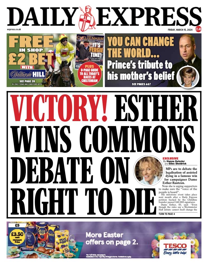 The Daily Express reports that MPs are preparing to discuss the legalisation of assisted dying, spurred by Esther Rantzen’s campaign.