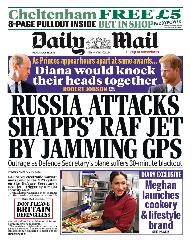 The Daily Mail reveals a 30-minute GPS jamming of an RAF jet carrying Defence Secretary Grant Shapps by Russian cyberhackers.
