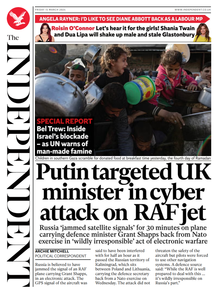 The Independent reports on allegations of Russia interfering with the satellite signals of an RAF jet carrying Defence Secretary Grant Shapps.