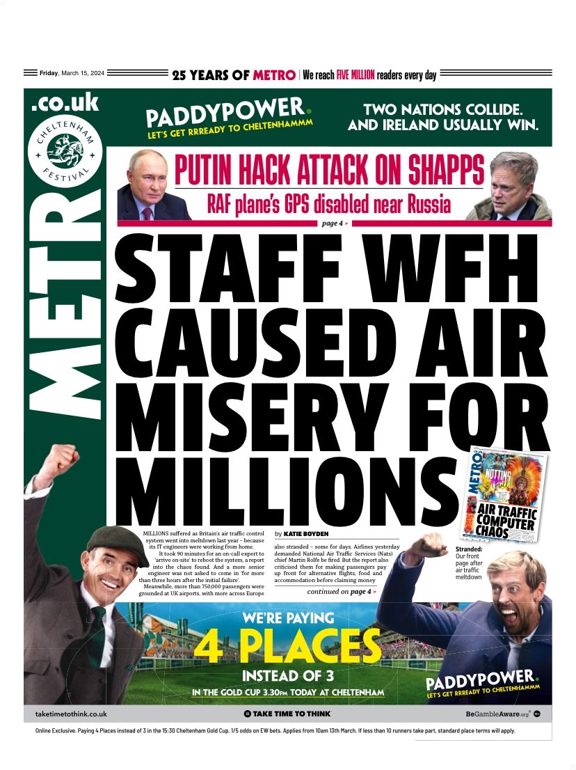 The Metro highlights a report on last year’s UK air traffic control system failure that disrupted numerous flights.