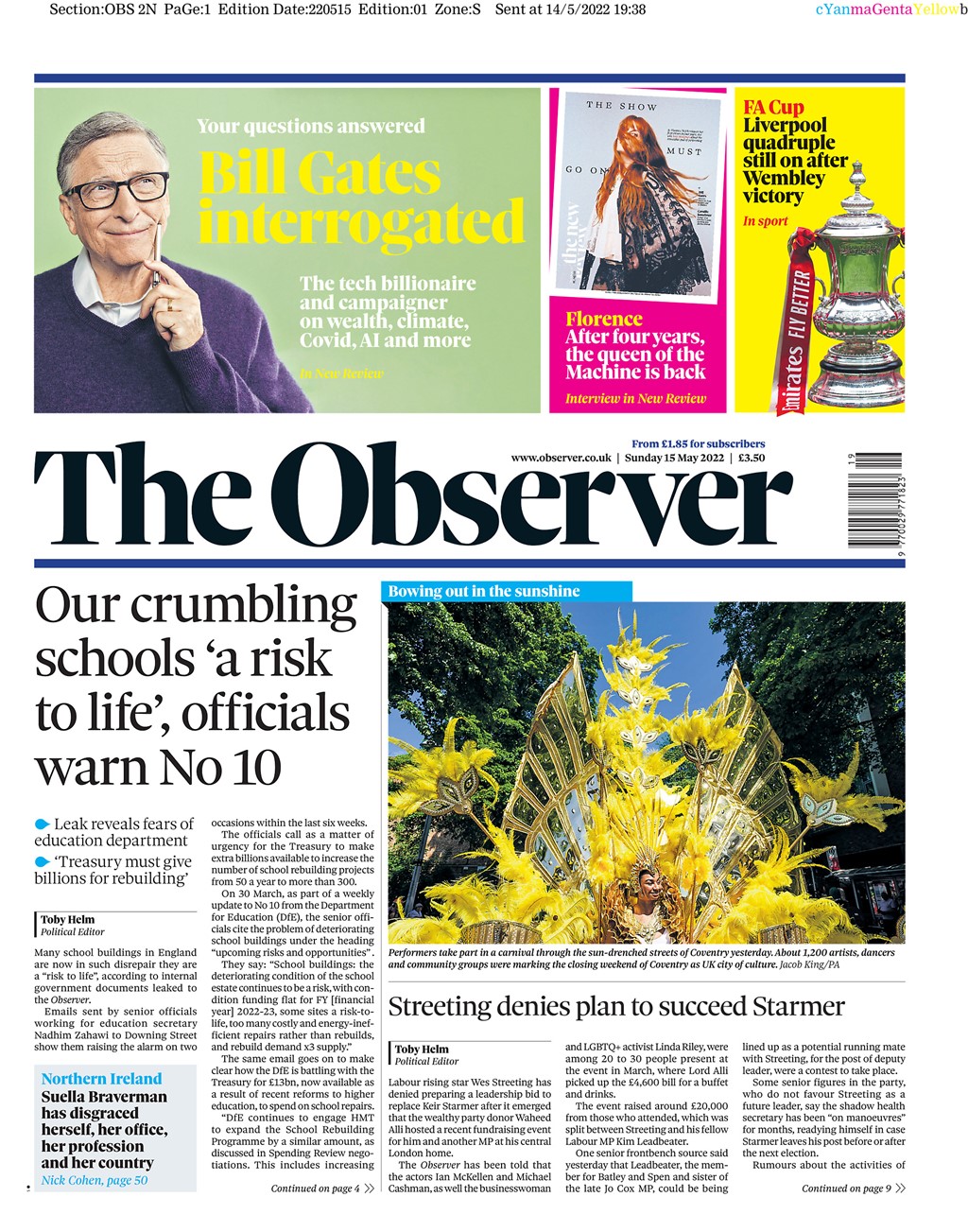 Some British schools are in such a poor state of repair that they pose a danger to students, according to the Observer. Meanwhile, Labour’s rising star West Streeting, it claims, has denied planning an attempt to unseat party leader Sir Keir Starmer.