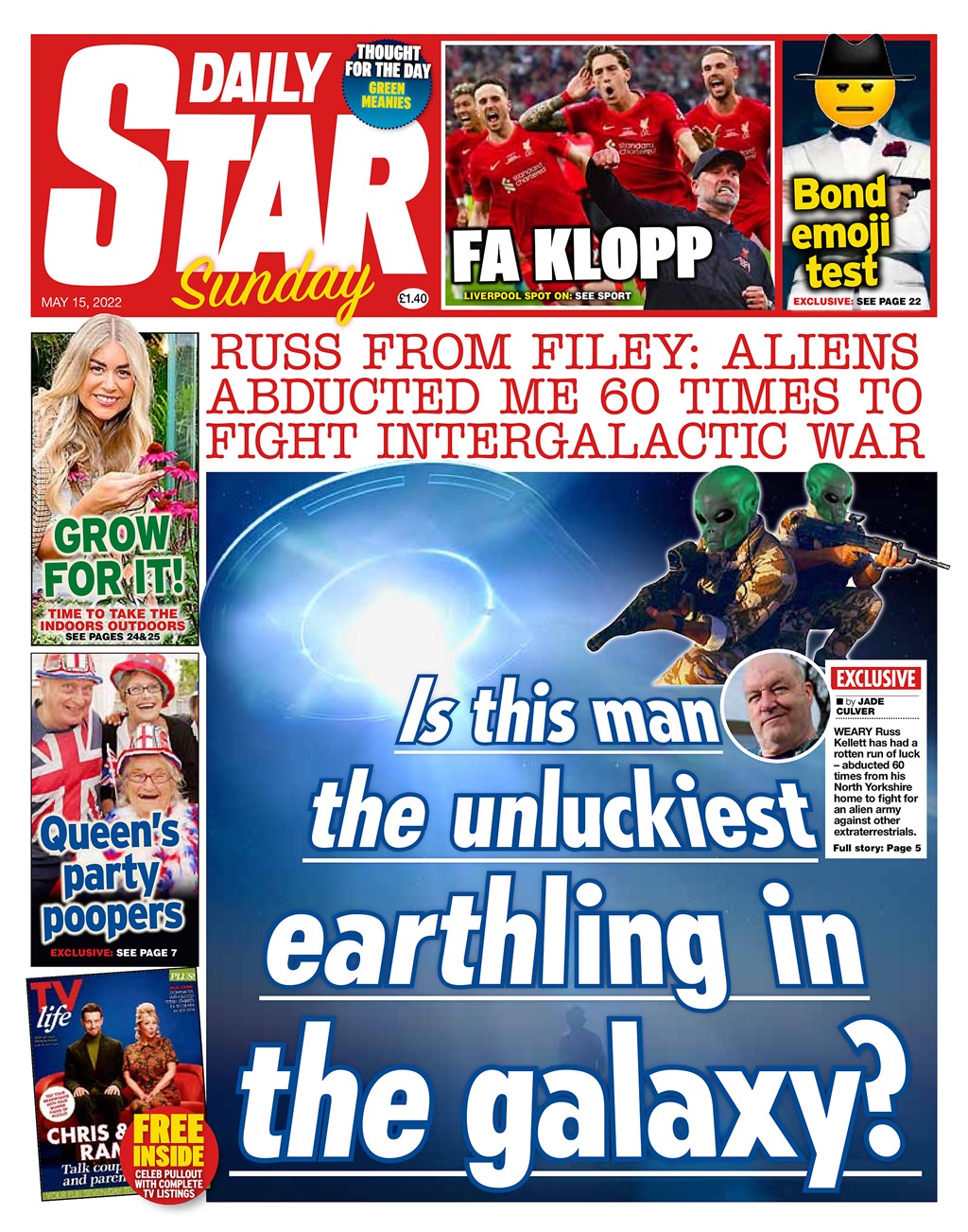 The story of a North Yorkshire man who claims to have been abducted 60 times by aliens who needed him to fight an intergalactic war is the front page of the Daily Star on Sunday.