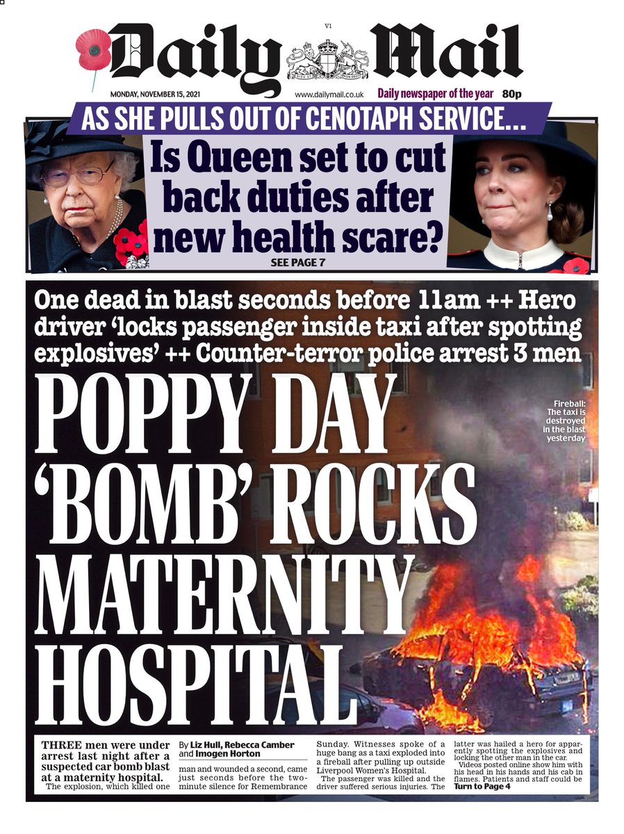 The Times writes that terrorists plotting a Remembrance Sunday atrocity are being investigated after a man died in a car explosion in Liverpool.