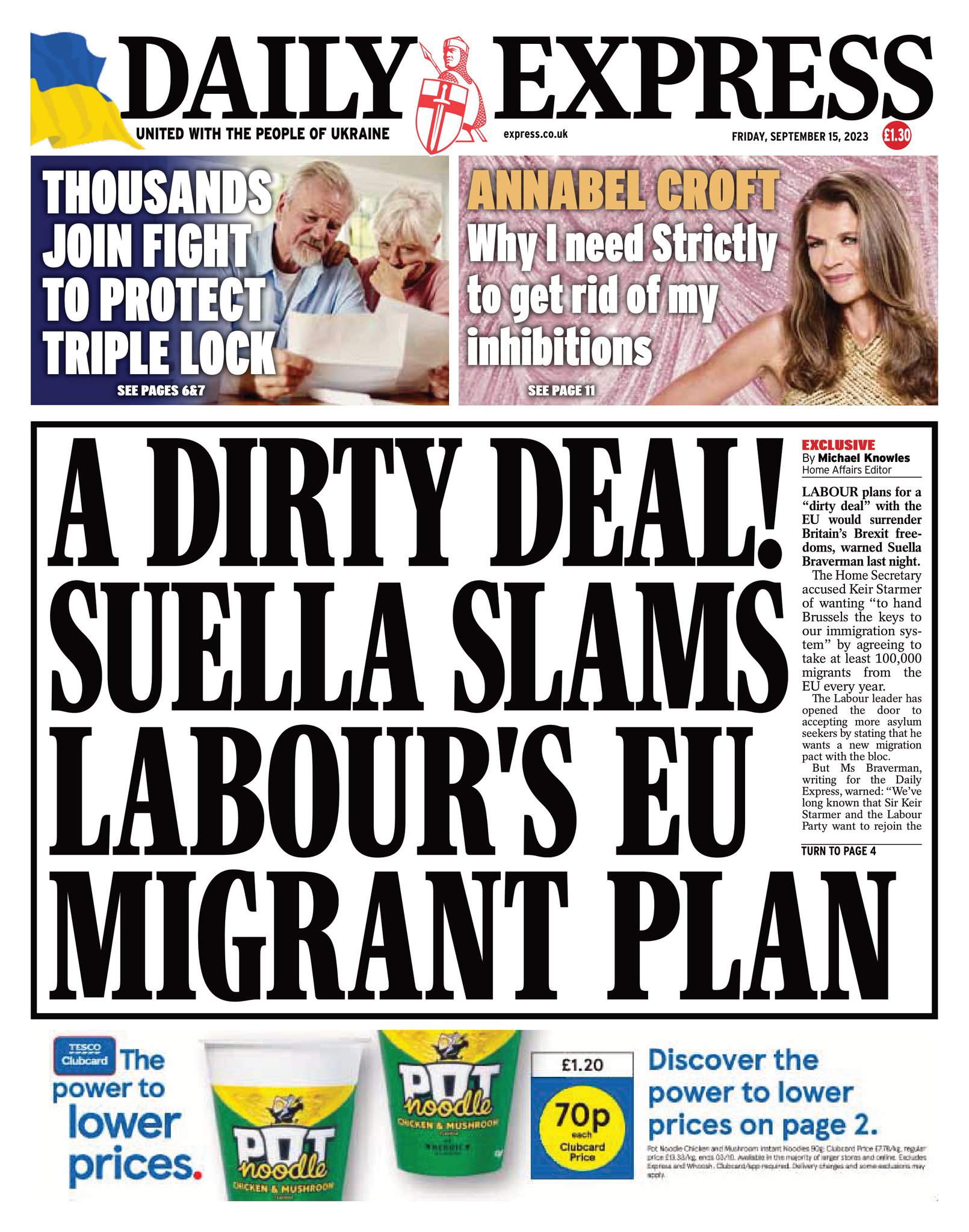 The Daily Express features Suella Braverman’s critique of Labour’s small boats crisis strategy, labelling it a “dirty deal”.