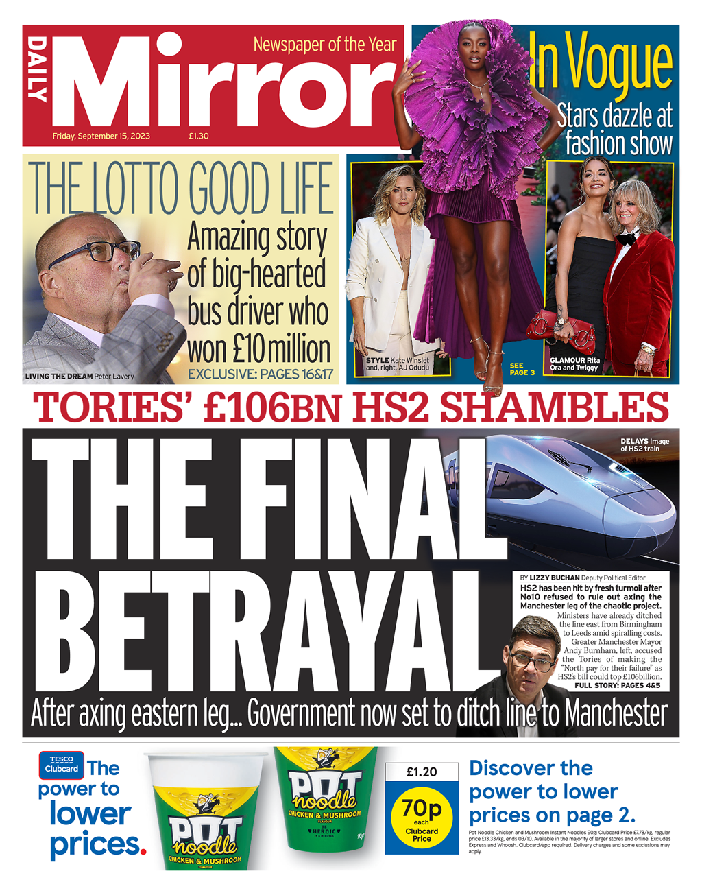 The Daily Mirror reports on Downing Street’s potential cancellation of HS2’s Manchester segment, terming it the “final betrayal”.