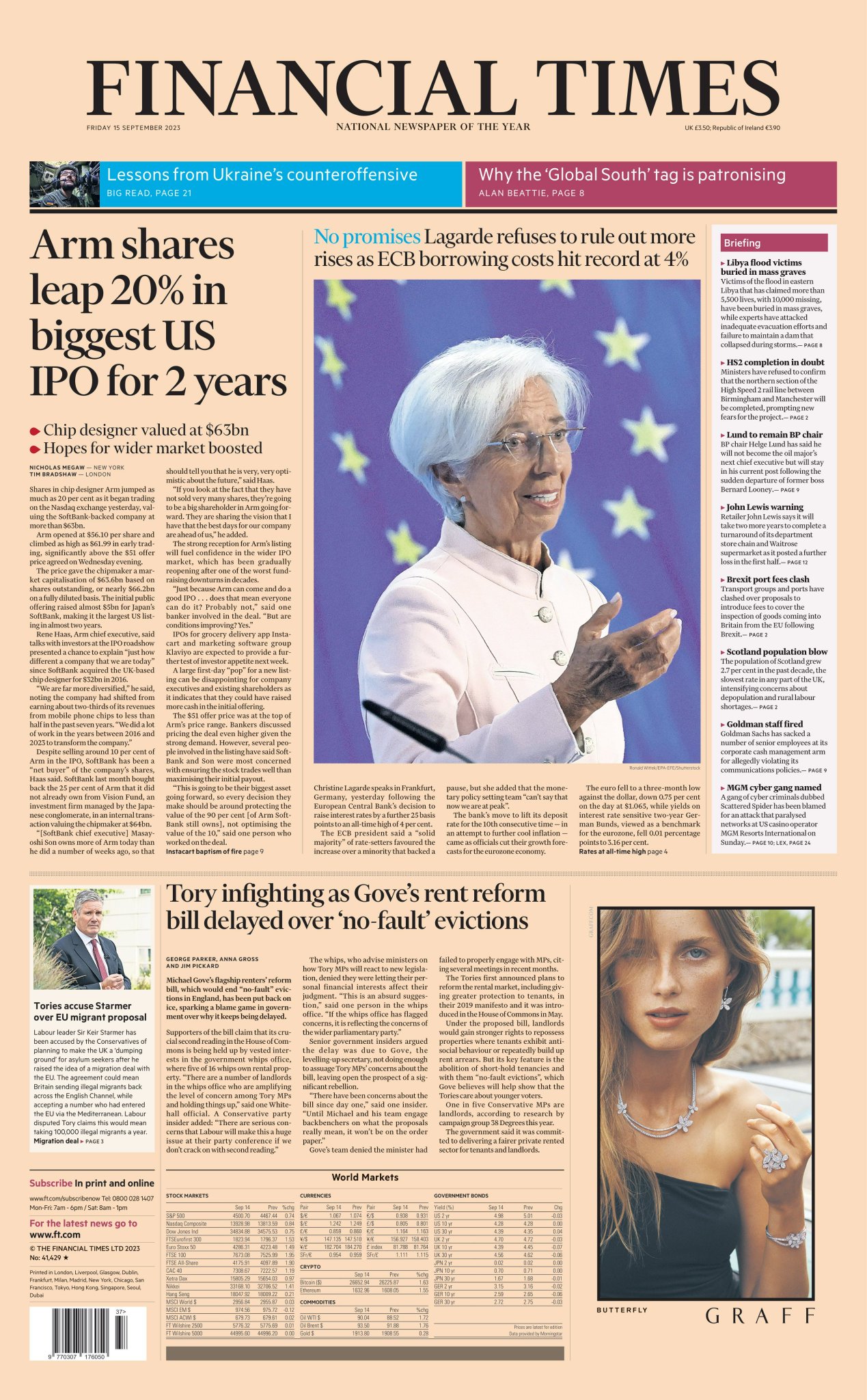 The Financial Times reports a 20% surge in Arm’s shares as it commences trading on the Nasdaq exchange.