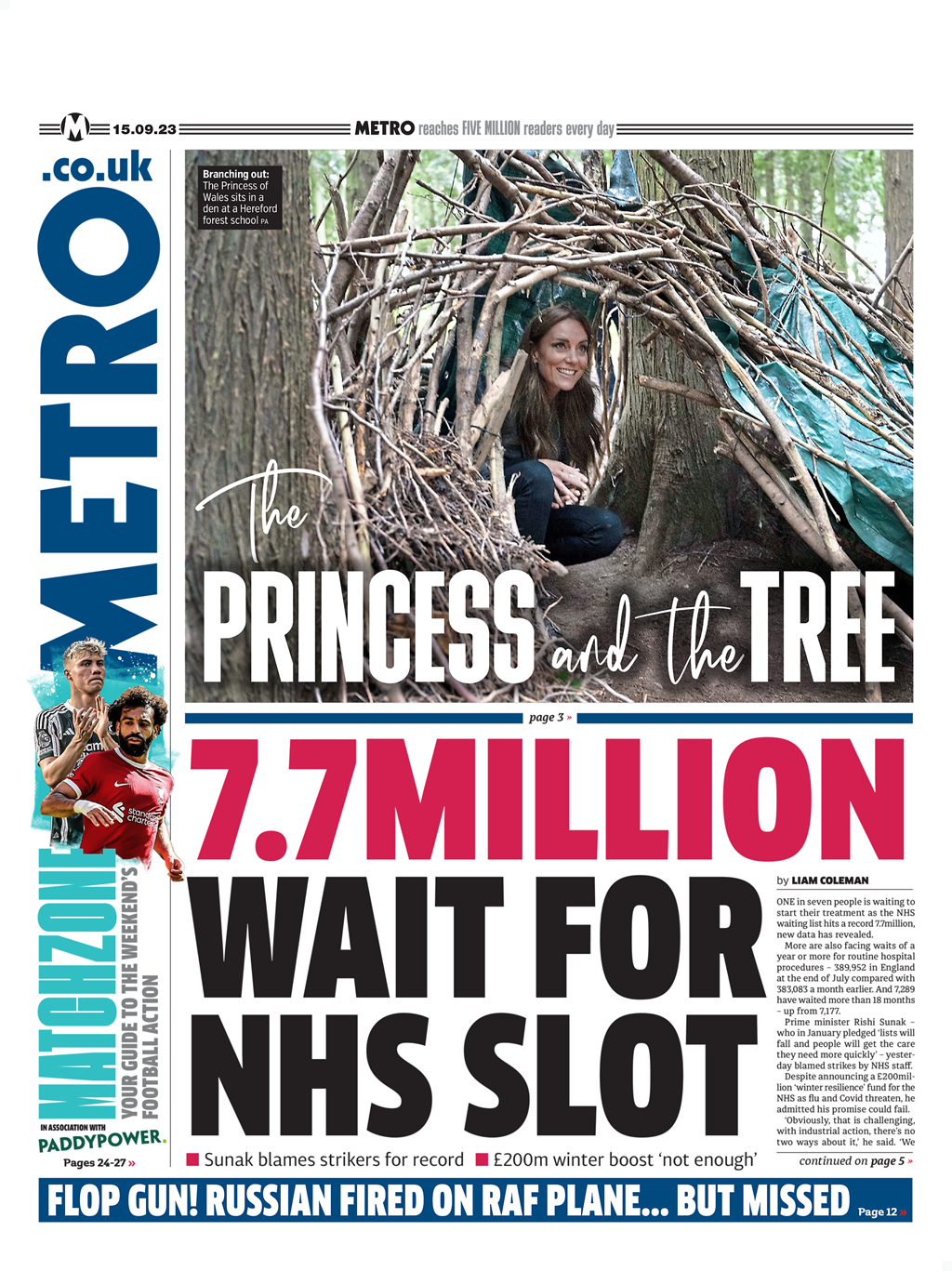 The Metro highlights the plight of 7.7 million people languishing on NHS waiting lists in England.