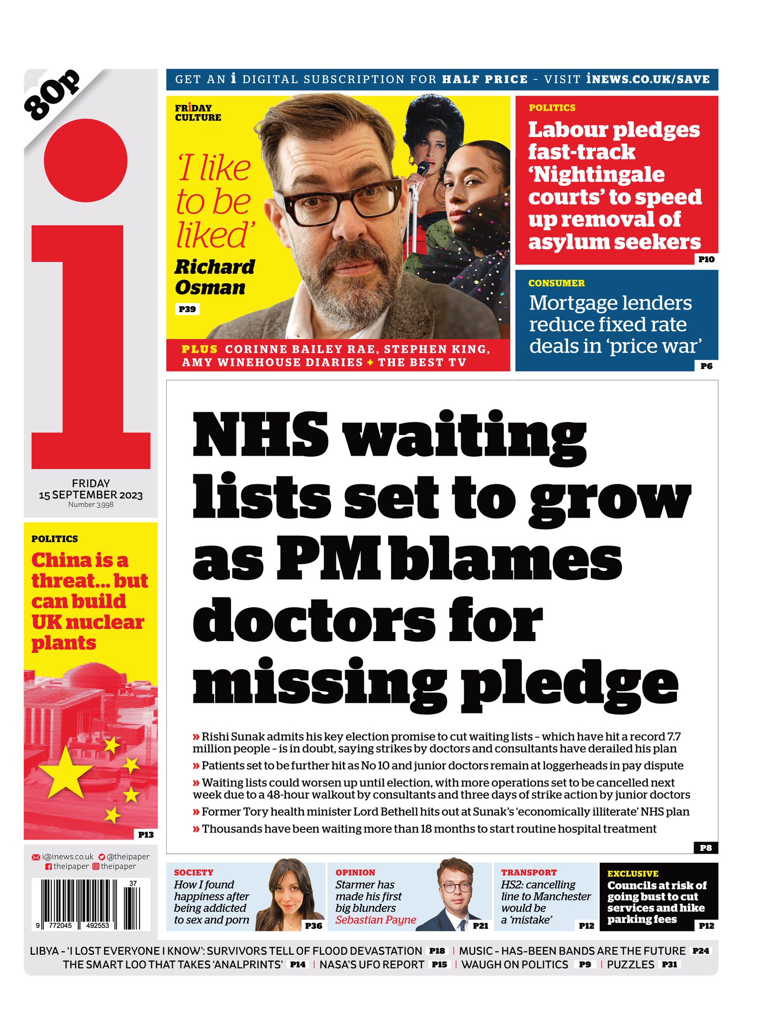 The i paper reports on Rishi Sunak attributing NHS waiting list backlog to doctors’ strikes, threatening his election pledge.