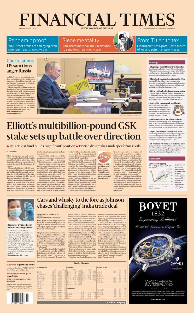 The Financial Times leads on the future of pharmaceuticals giant, GlaxoSmithKline, after a hedge fund took a large stake.