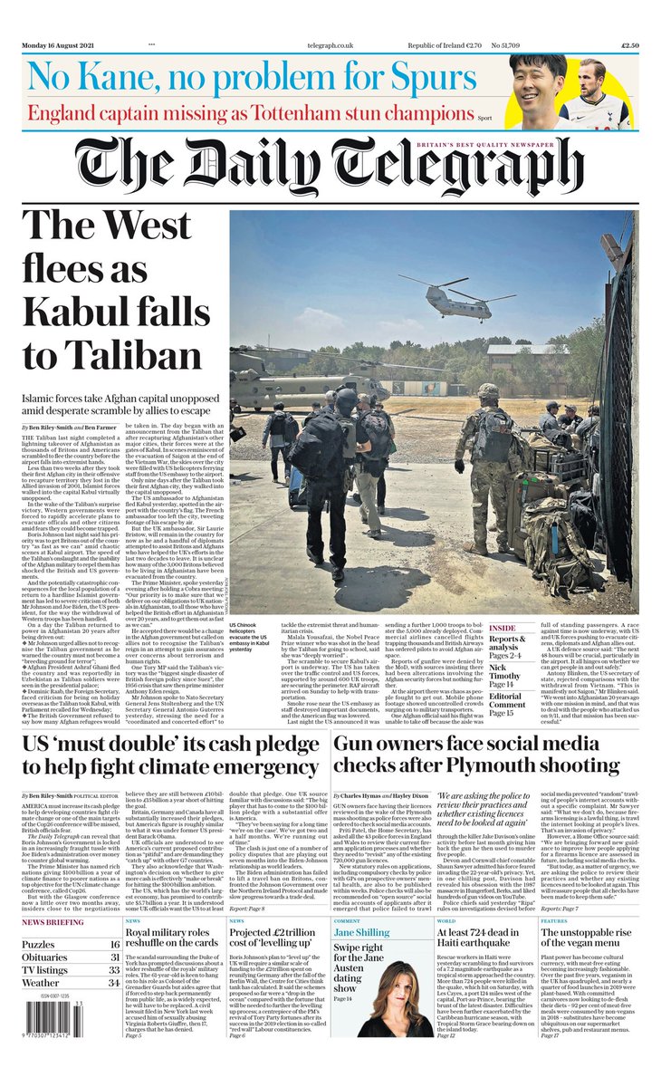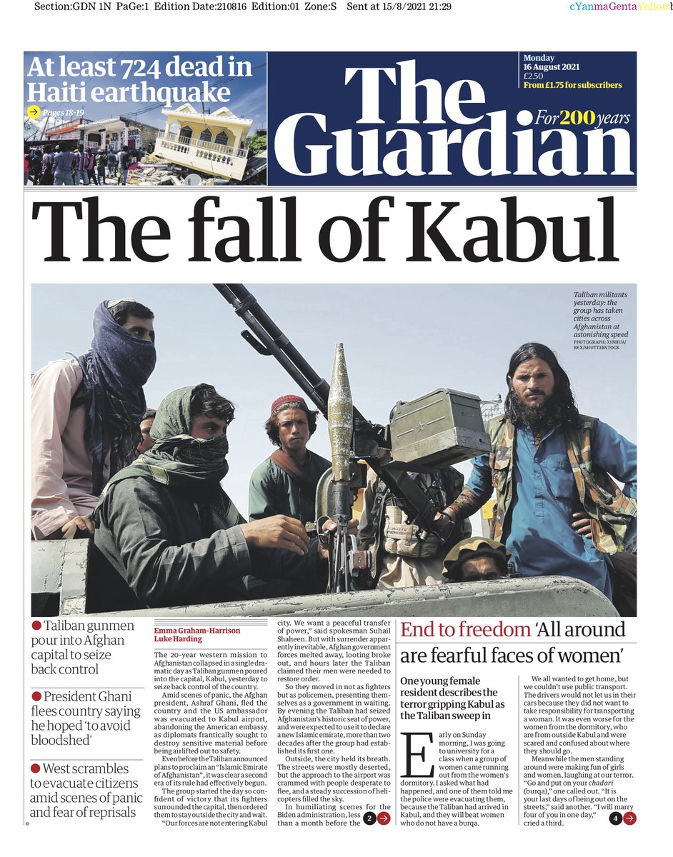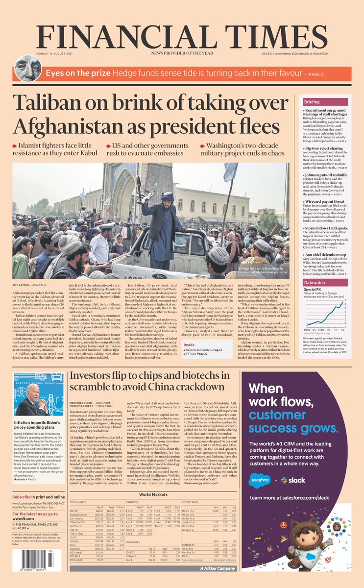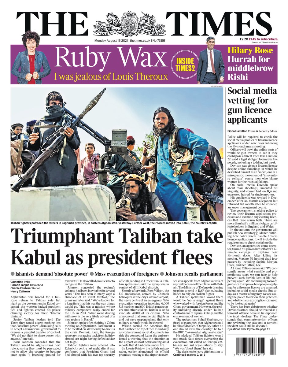 Afghanistan was braced for a full-scale return to Taliban rule last night as the government collapsed, the western-backed president fled, and fighters entered his palace claiming victory for their “Islamic Emirate”, The Times reports.