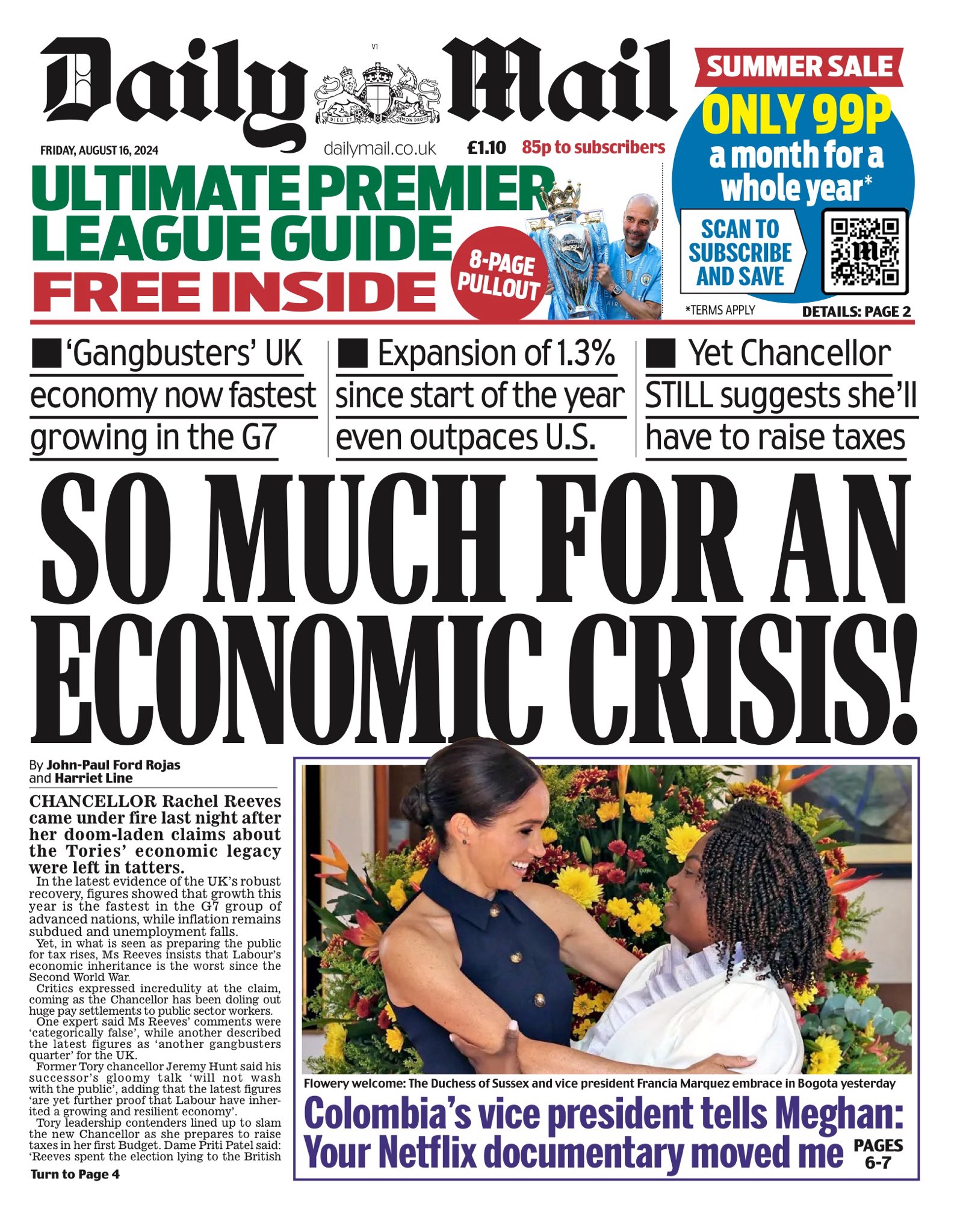 The Daily Express reports that Chancellor Rachel Reeves has been advised against raising taxes due to recent economic growth.