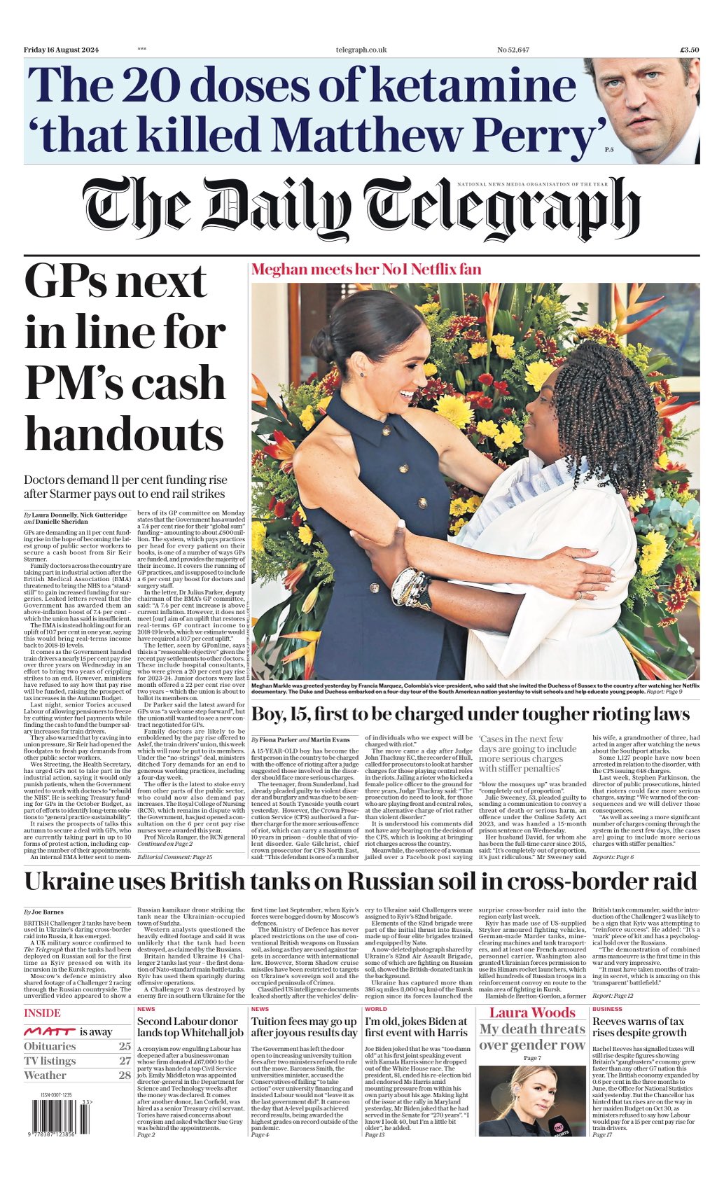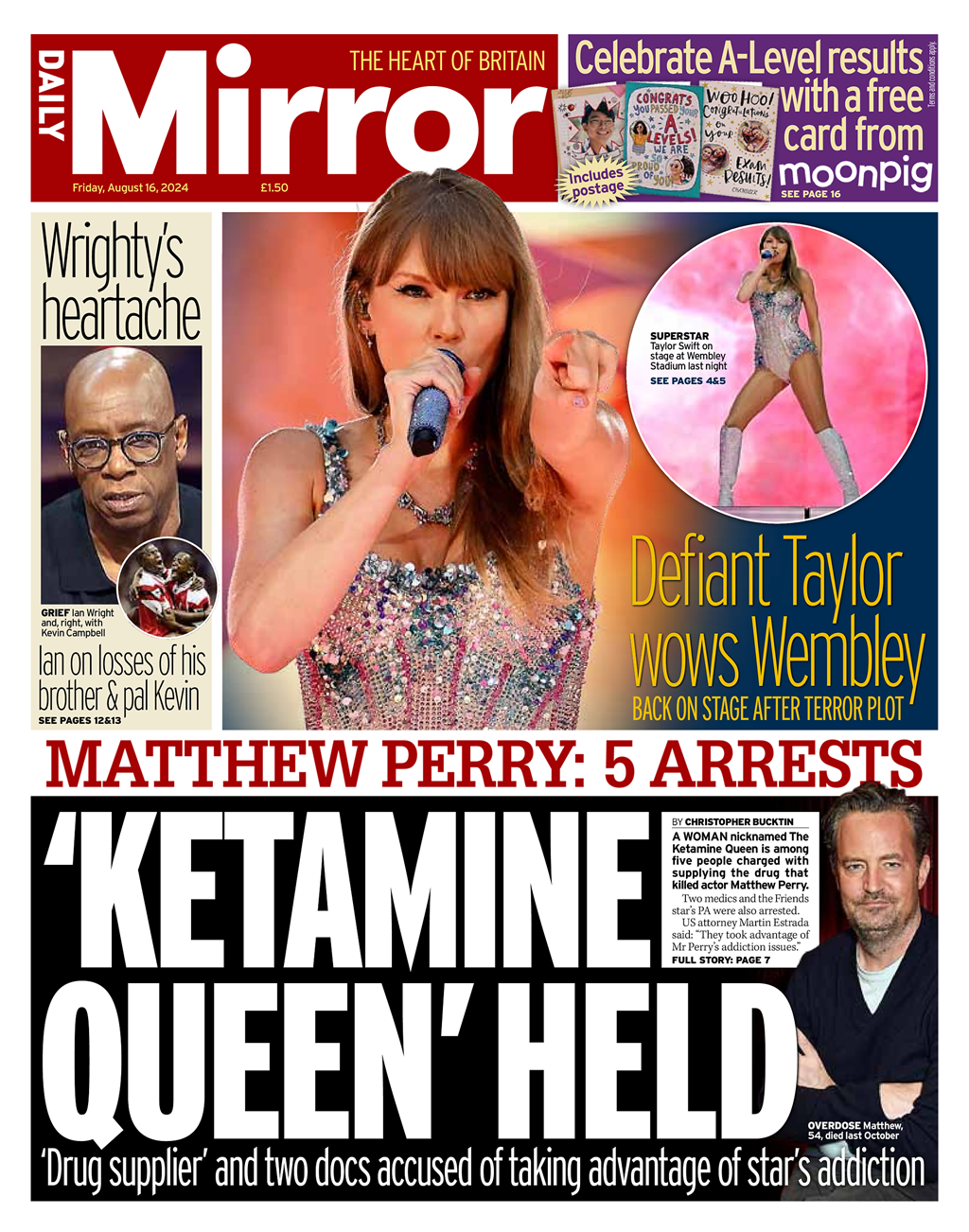 The Daily Mirror reports on the five arrests linked to the drug overdose death of Friends star Matthew Perry.