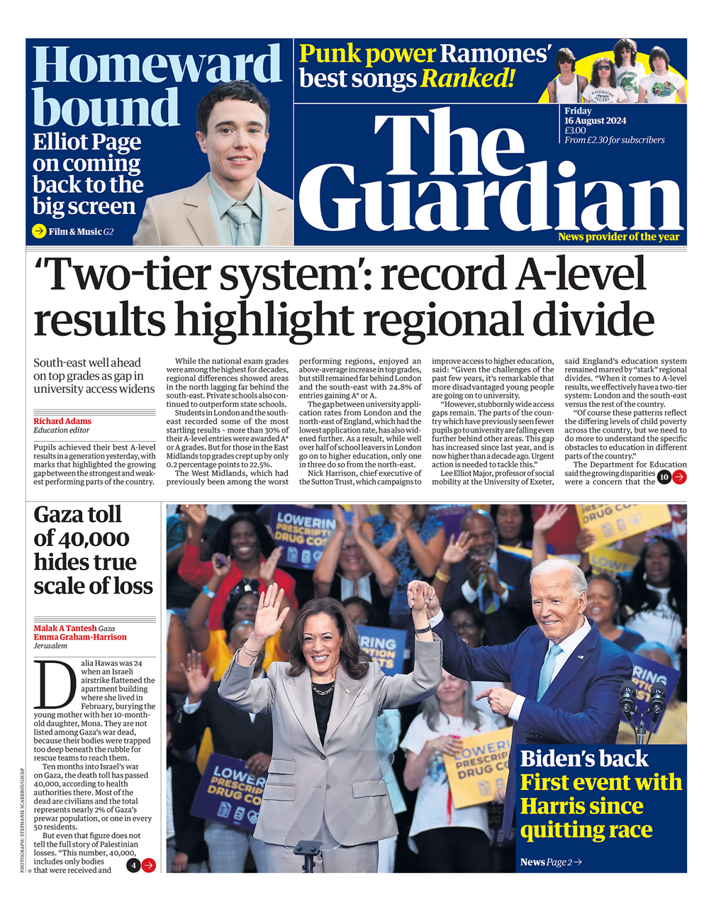 The Guardian reports that Thursday’s record A-level results have underscored the widening regional disparities in student performance.