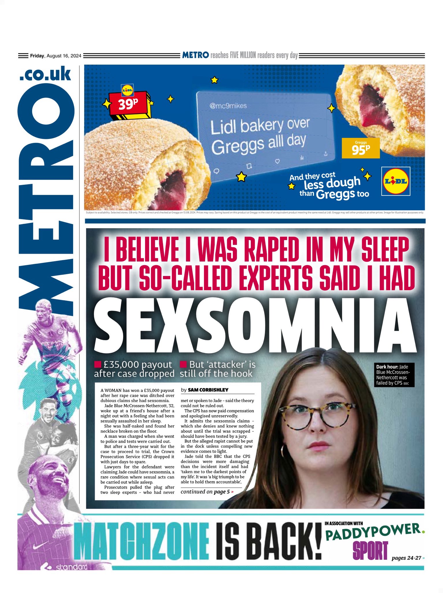 Jade Blue McCrossen-Nethercott received a £35,000 payout after her rape case was dropped when experts suggested she had ‘sexsomnia’, a condition where sexual acts can be carried out while asleep.