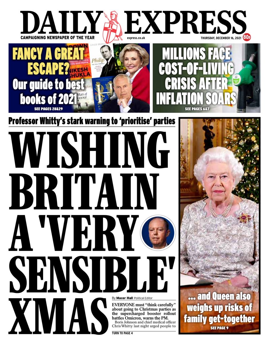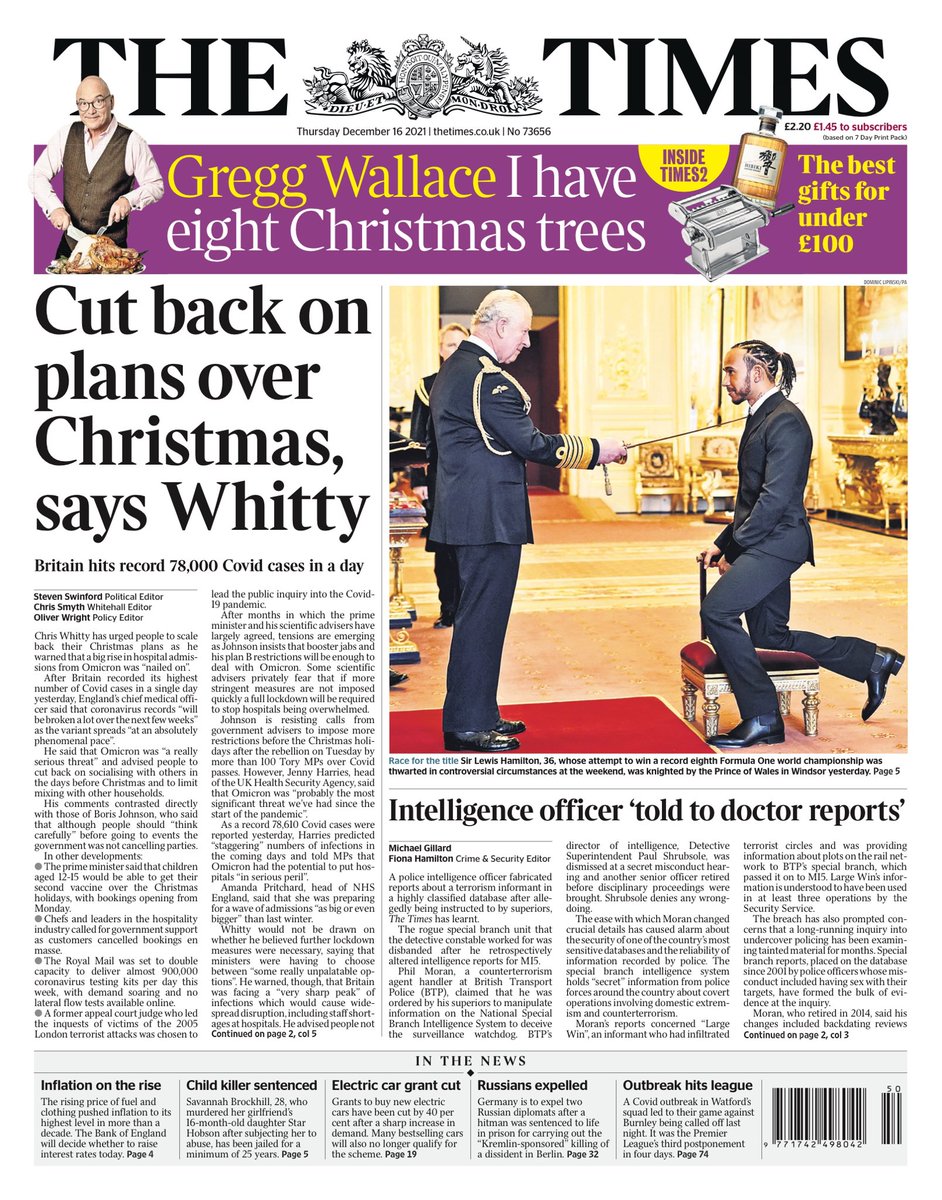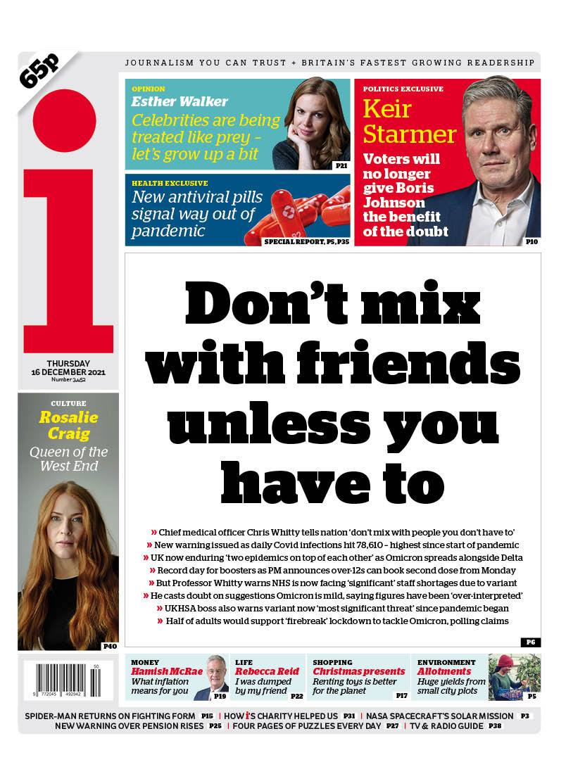 Professor Chris Whitty’s warning about mixing this Christmas and the spread of Omicron variant is on the front page of The Times.