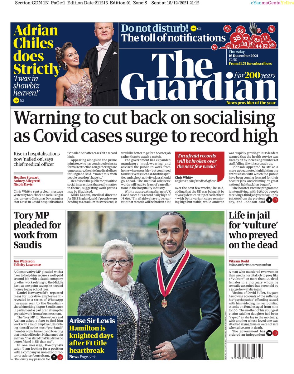 A warning to limit Christmas socialising is on the front of The Guardian.