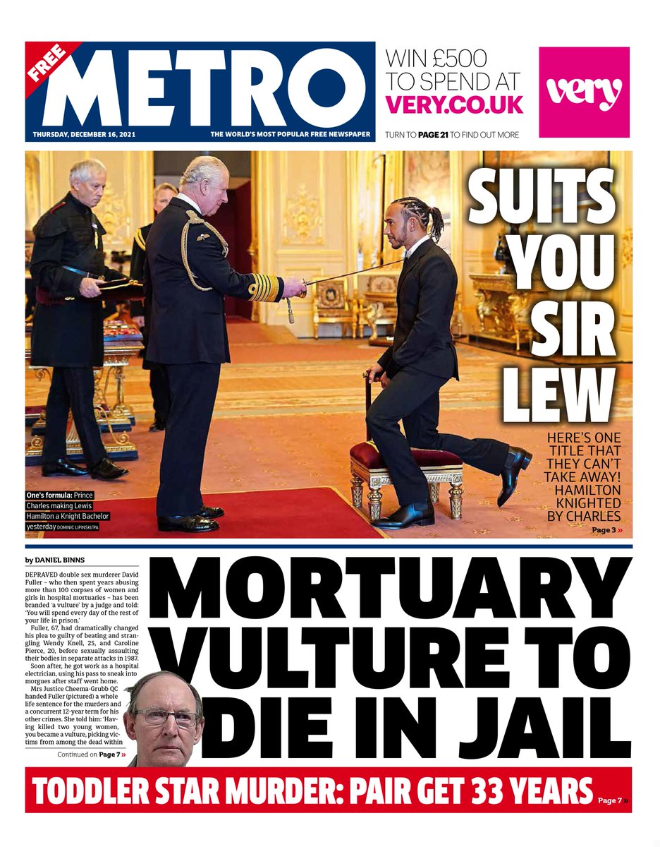 The Metro leads on the sentencing of murderer David Fuller, who was found to have sexually assaulted bodies in a mortuary.