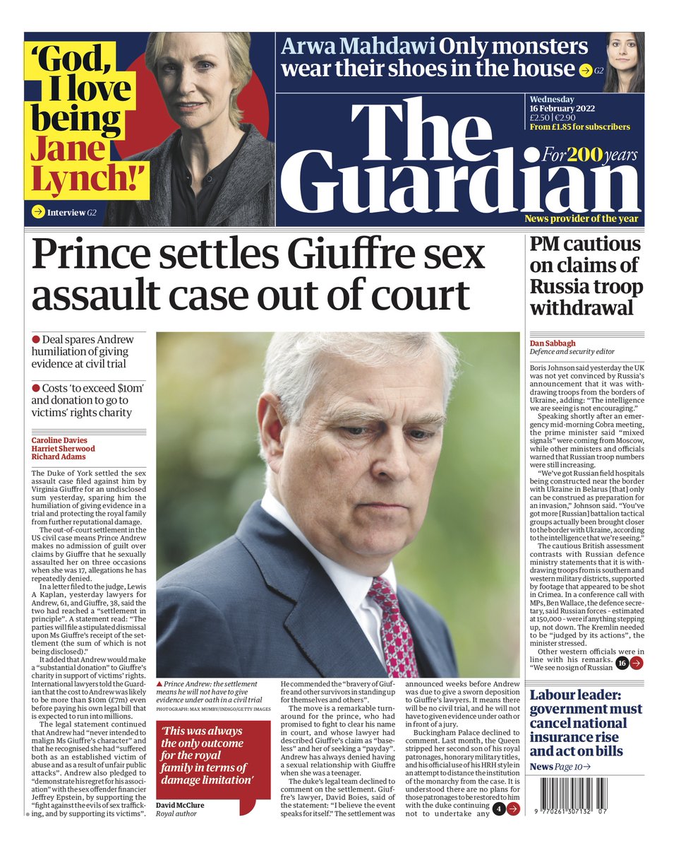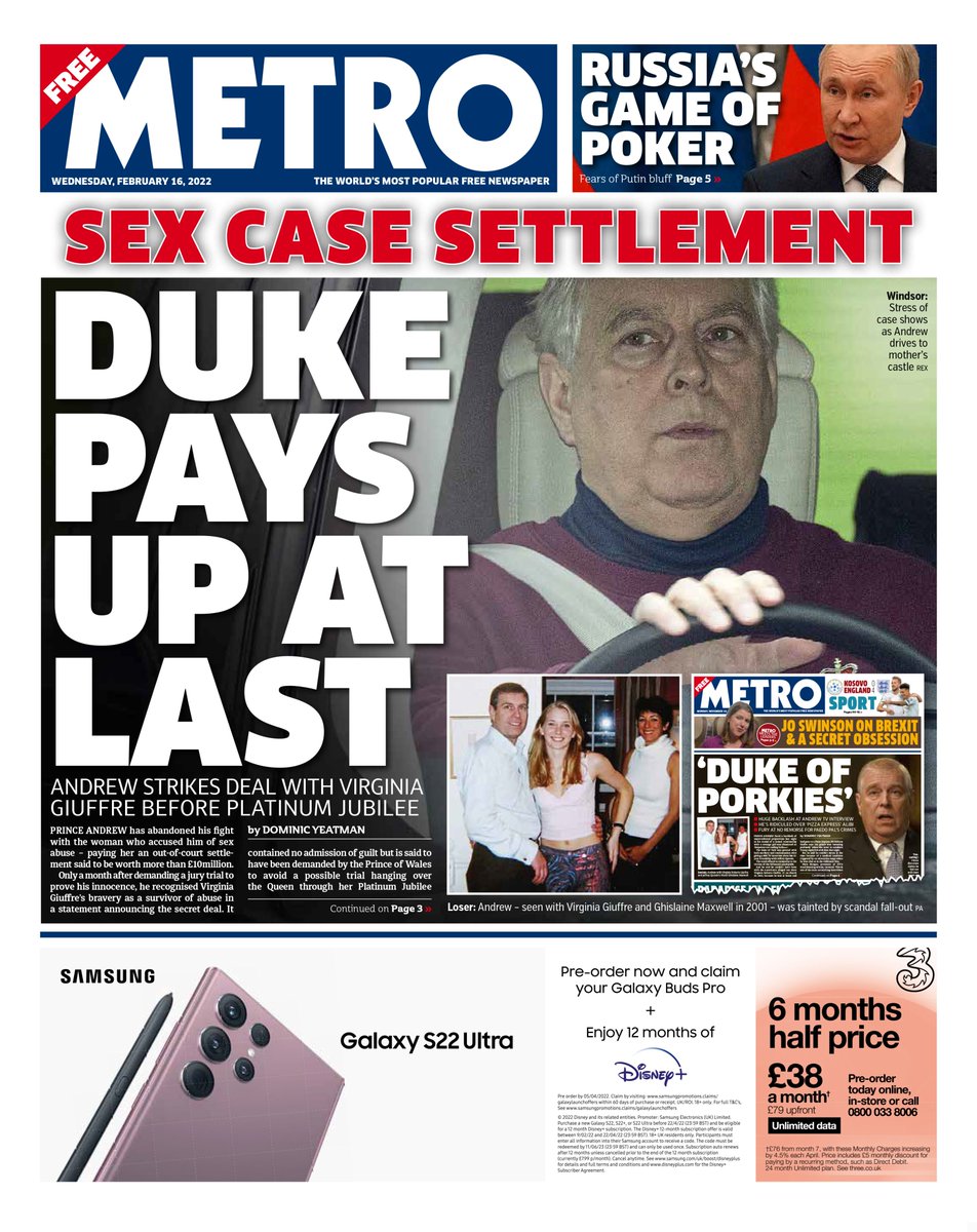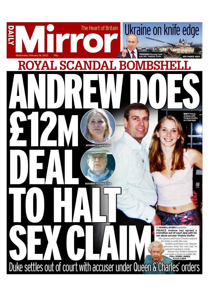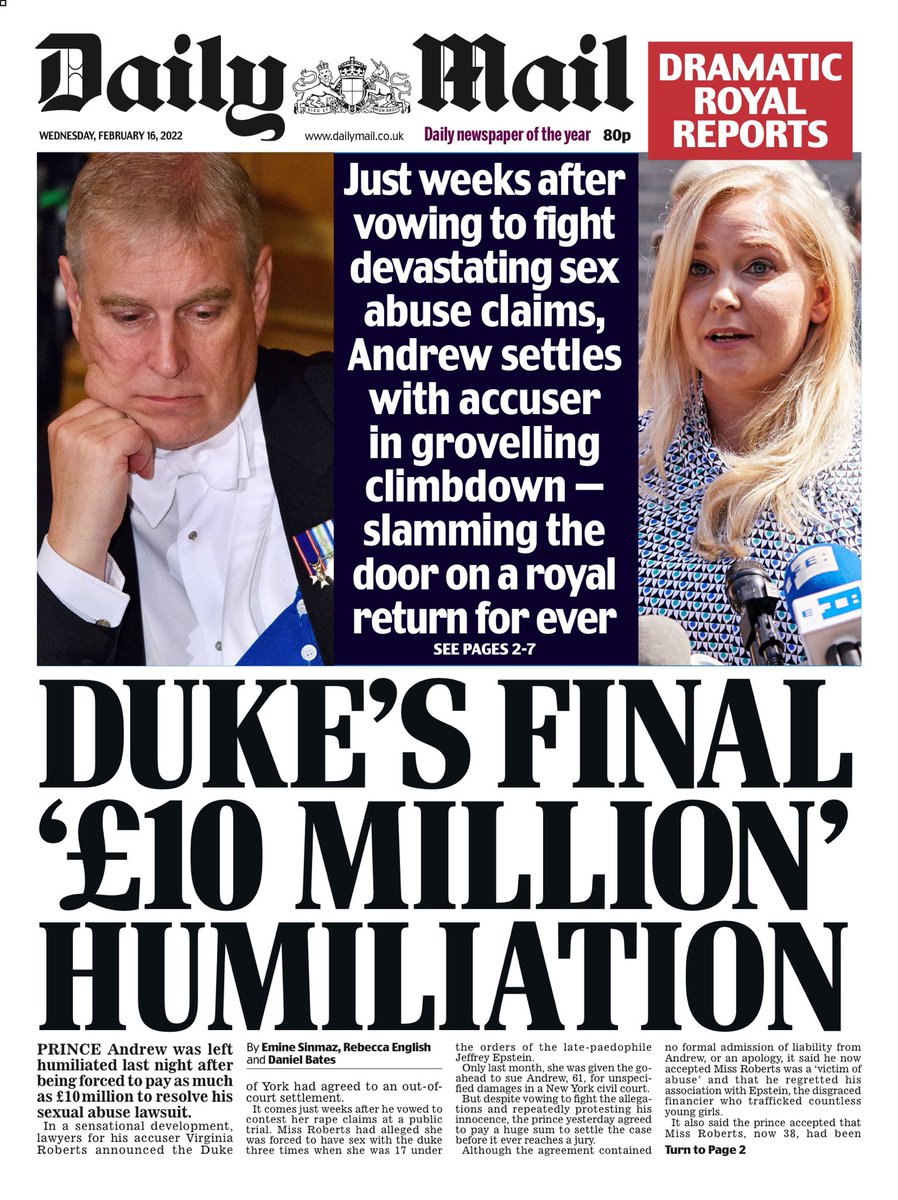 The Mail says the sex case settlement is Prince Andrew’s “final humiliation”. His accuser claimed she had been forced to have sex with him three times when she was 17, the paper adds.The settlement comes only a few weeks after Andrew said he wanted a jury trial.