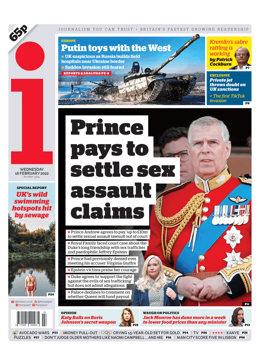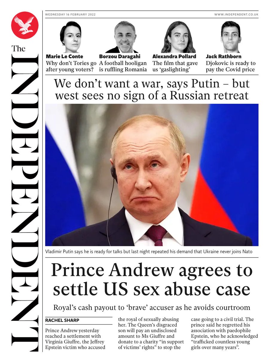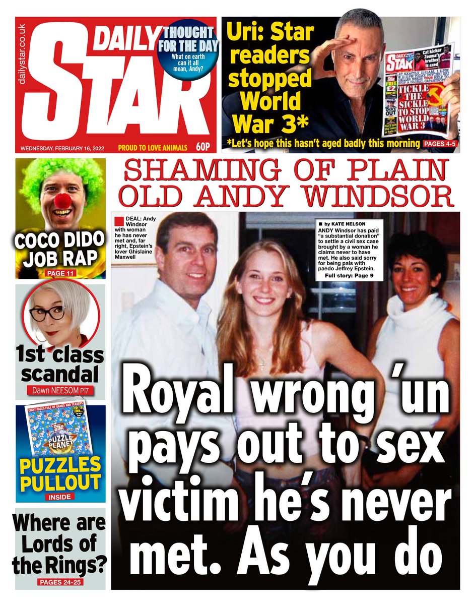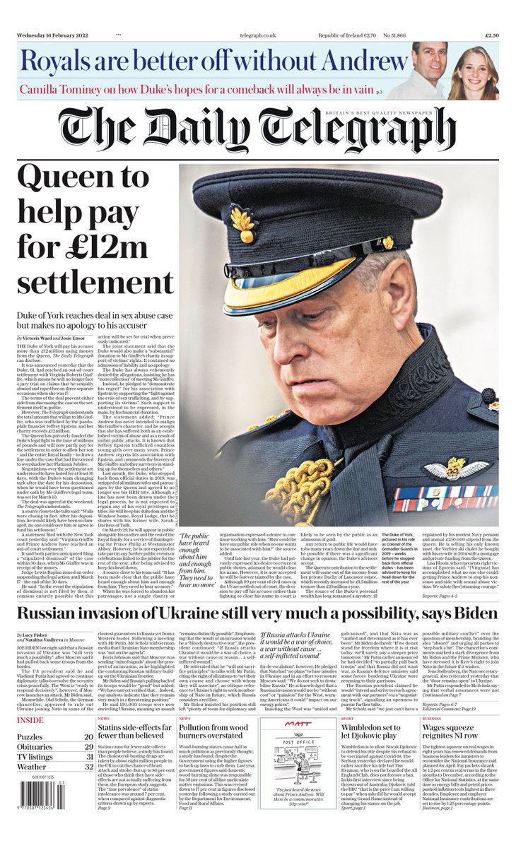 The Mail says the sex case settlement is Prince Andrew’s “final humiliation”. His accuser claimed she had been forced to have sex with him three times when she was 17, the paper adds.The settlement comes only a few weeks after Andrew said he wanted a jury trial.