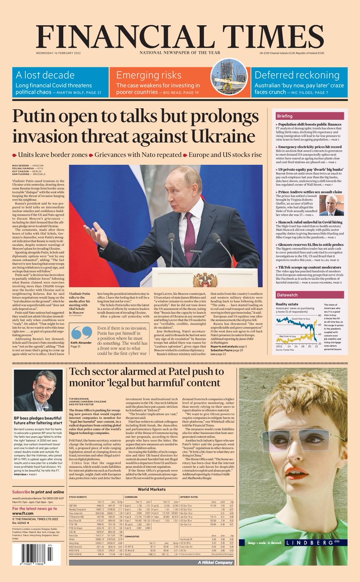 The FT says the Russian president eased tensions over Ukraine by apparently drawing down some troops from the border to enable talks with West. However, it adds that the invasion threat still remains.