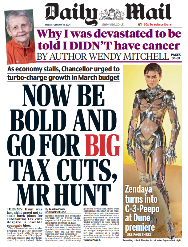 The Daily Mail highlights calls for the chancellor to implement tax cuts in the imminent budget due to the UK’s recession.
