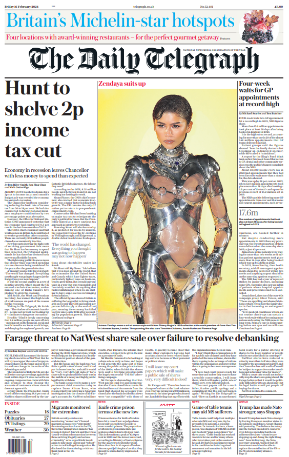 The Daily Telegraph reveals that Chancellor Jeremy Hunt is abandoning plans for a 2p income tax cut due to the UK’s recession.