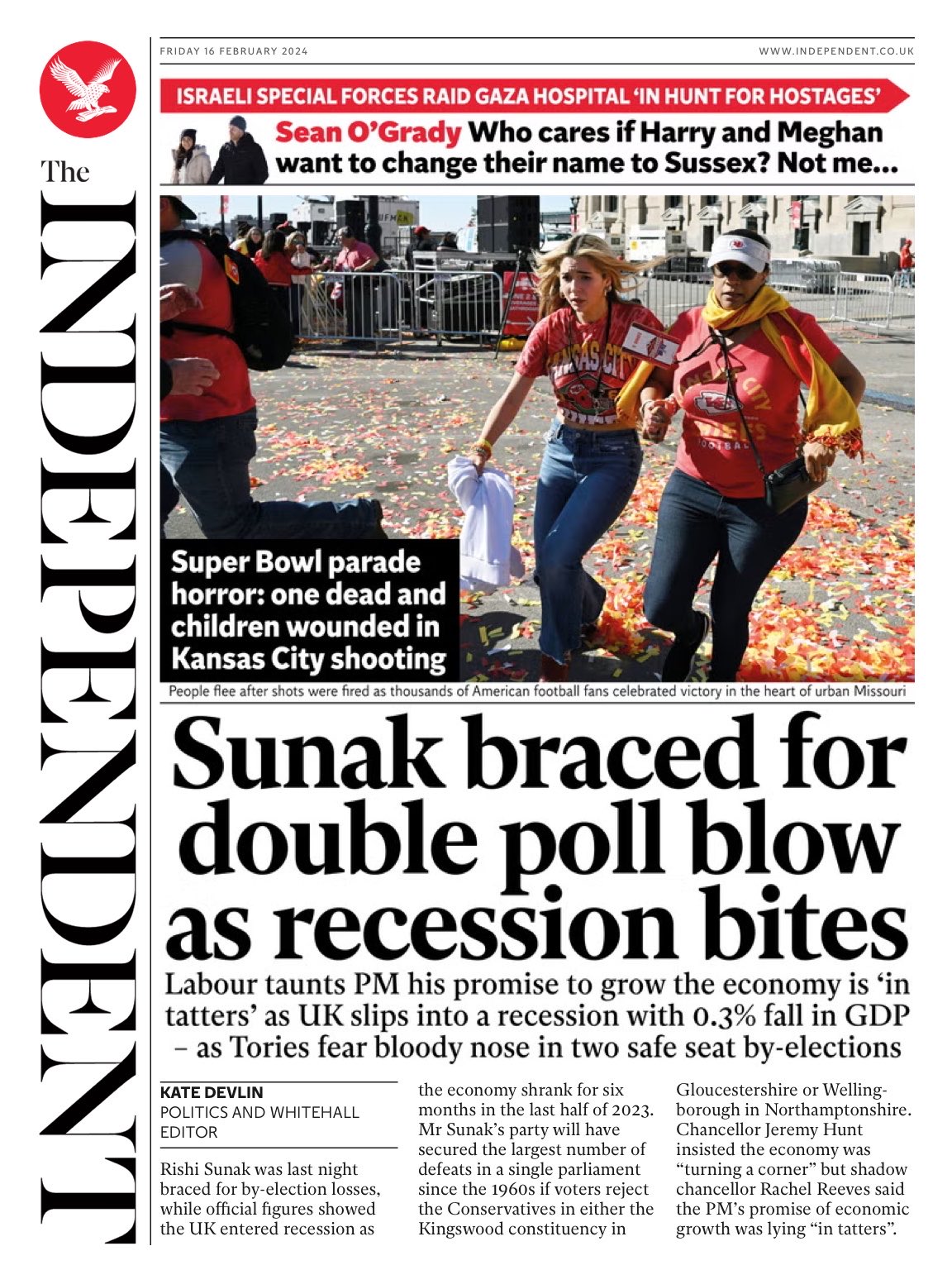 The Daily Mirror highlights the UK’s plunge into recession, coining the term “Rishession”.