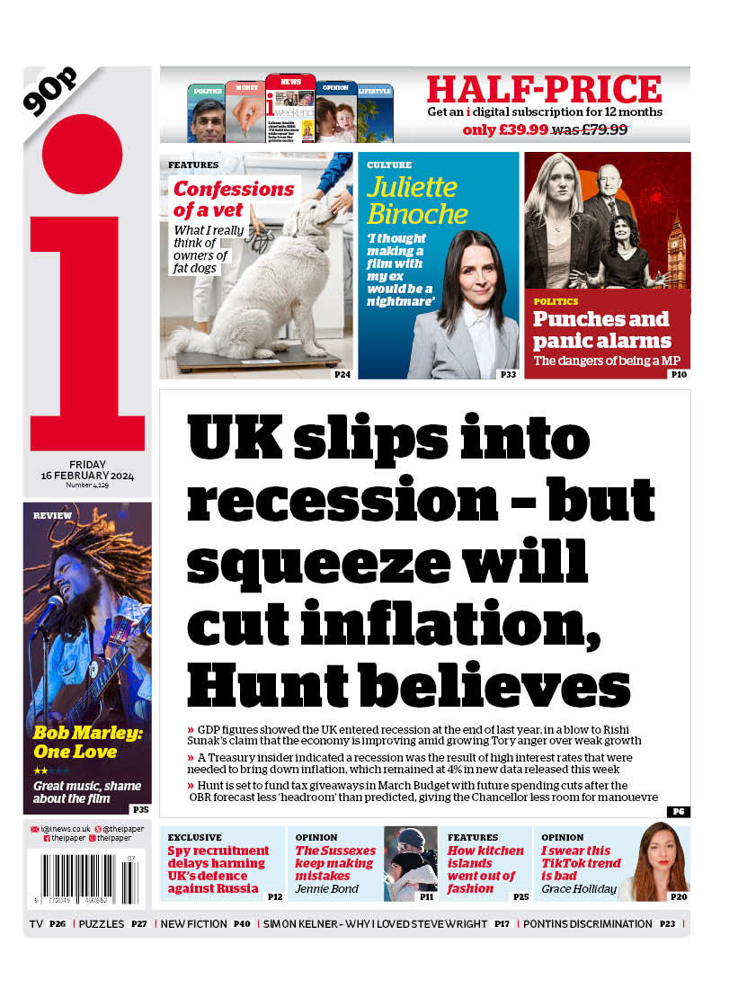 The i paper highlights the UK’s recession and Chancellor Hunt’s forecast of an inflation cut.