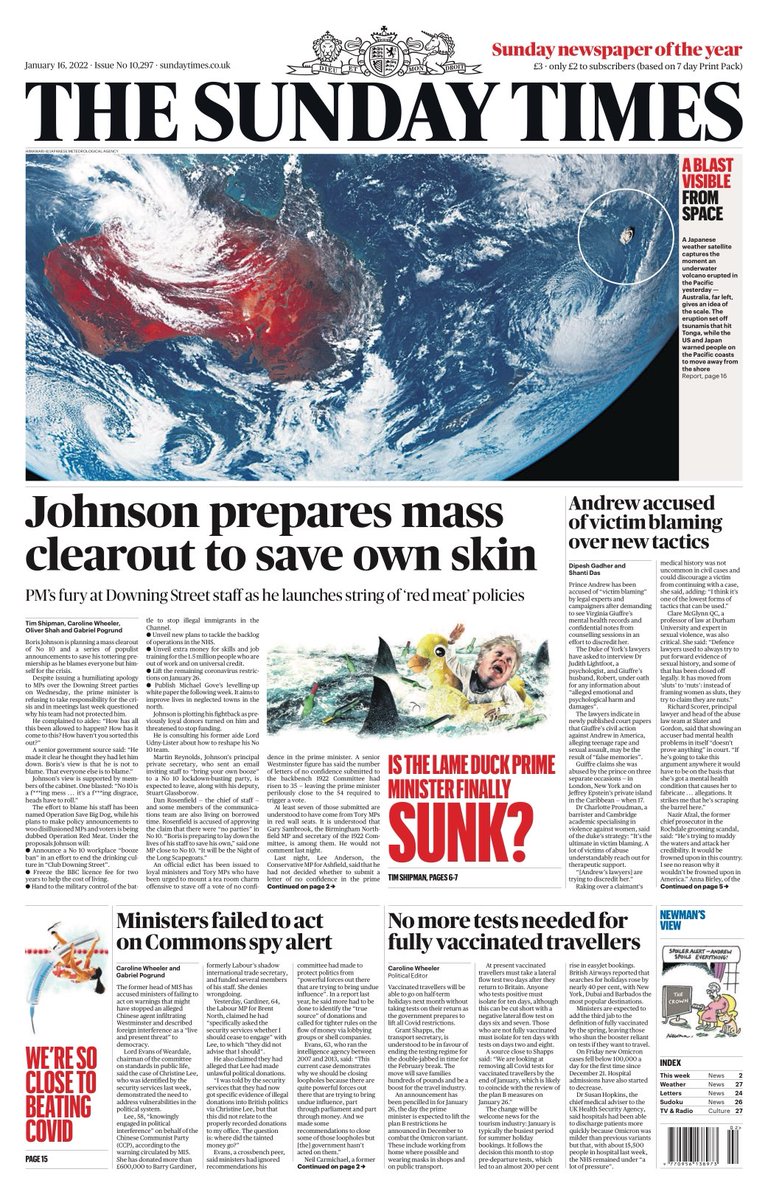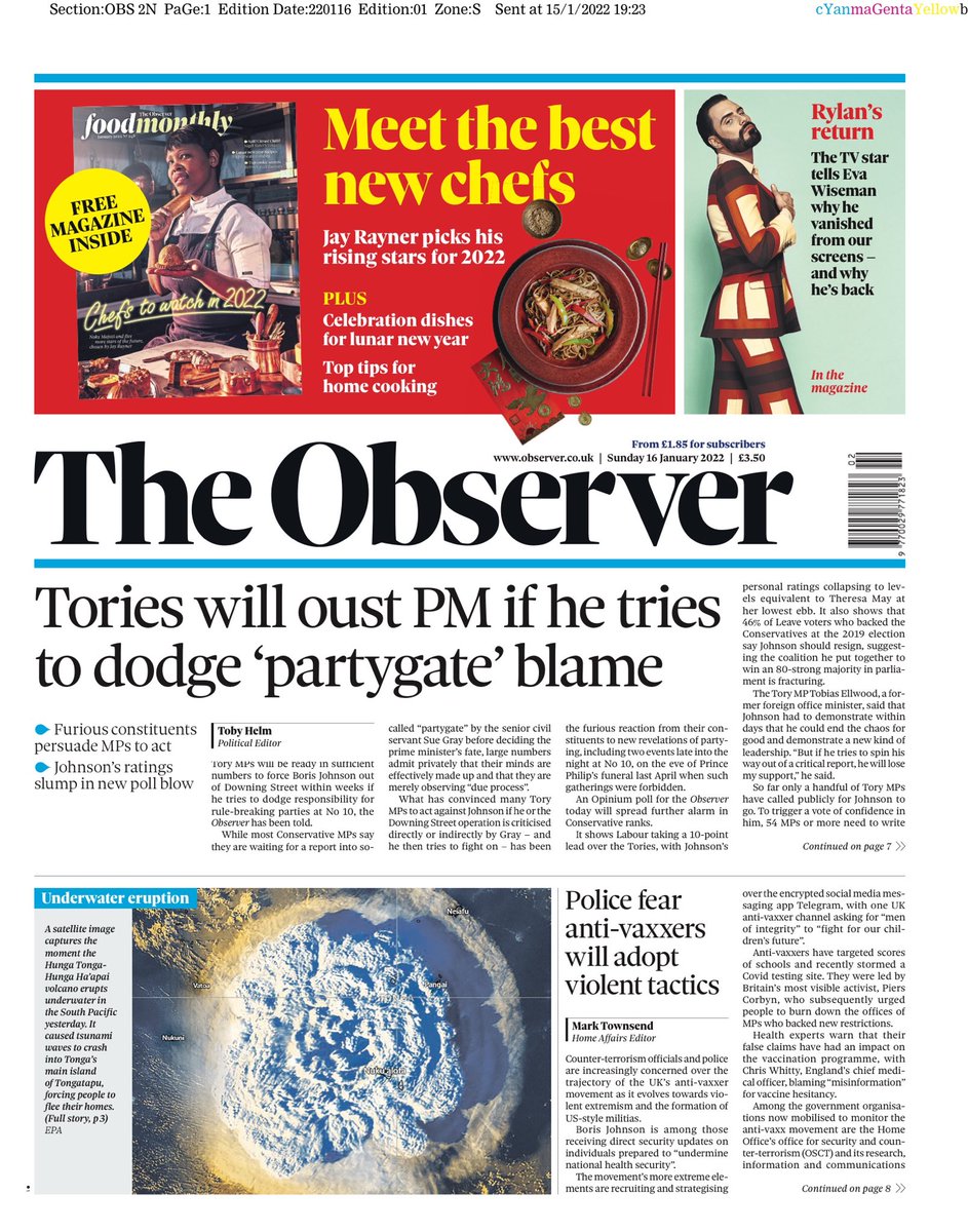 Tory MPs are ready to oust Boris Johnson if he tries to dodge responsibility for rule-breaking parties at No 10 – that’s on the front of The Observer.