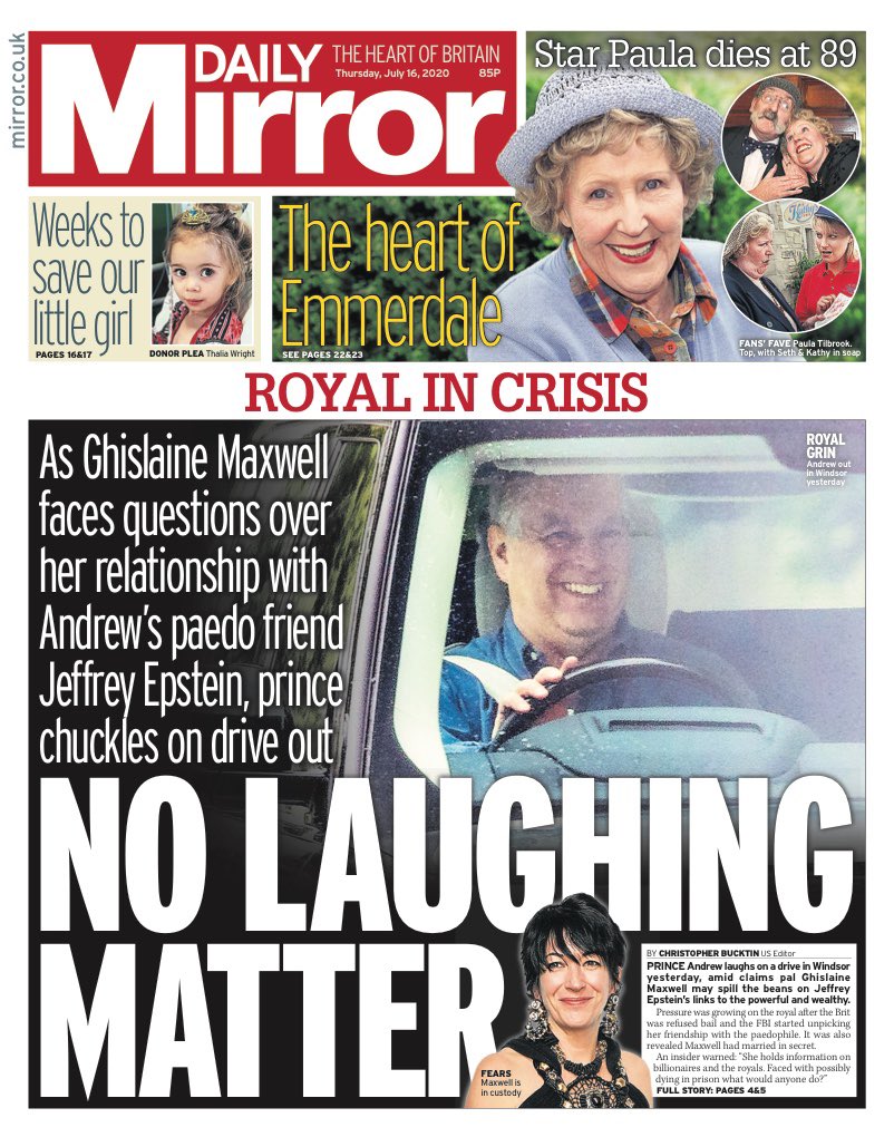 The Daily Mirror leads with an image of Prince Andrew laughing on a drive to Windsor amid claims his friend Ghislaine Maxwell may reveal Jeffrey Epstein’s links to the powerful and wealthy.