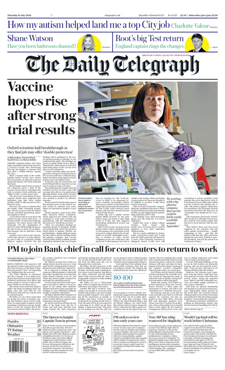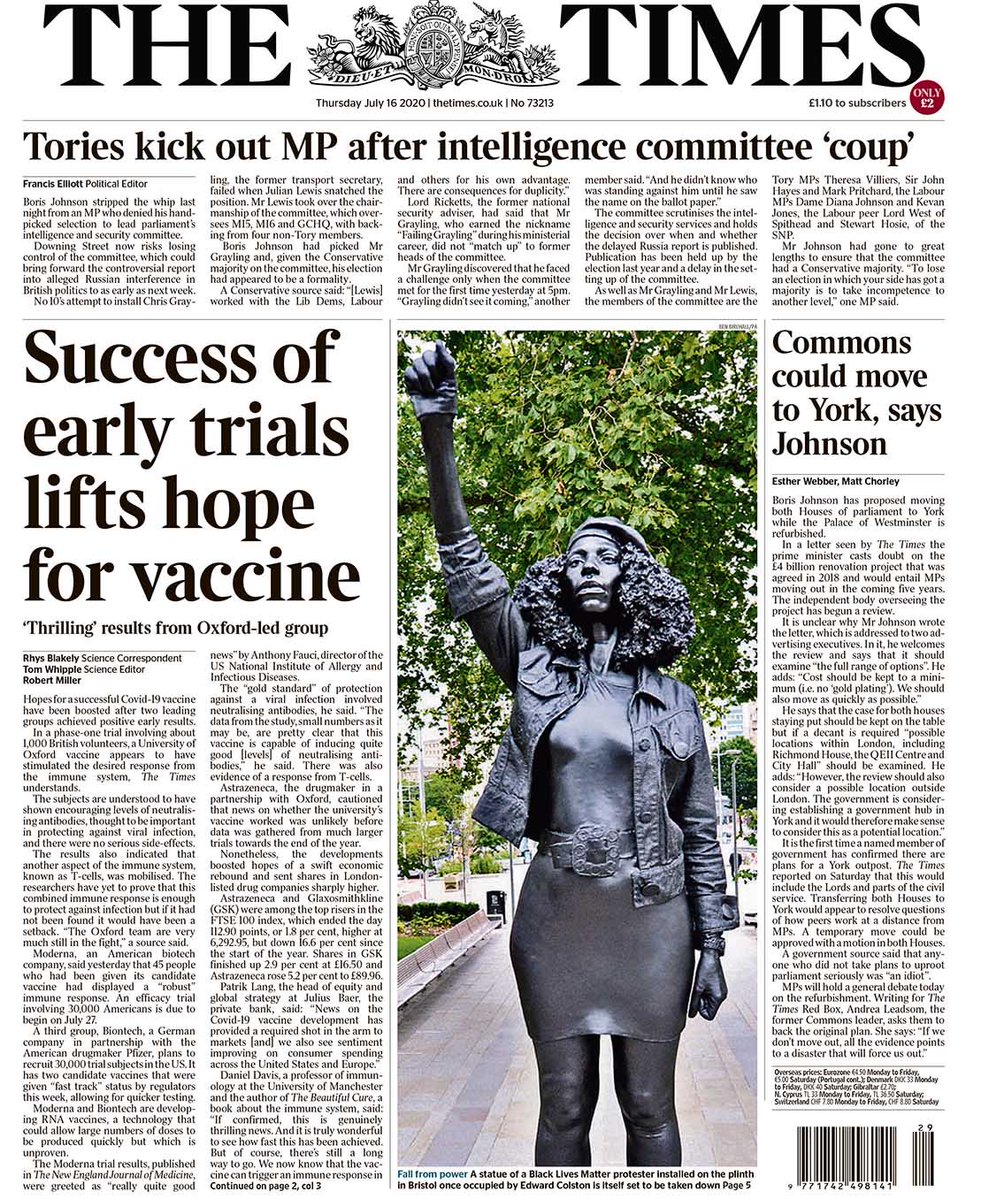The Times leads with hopes for a successful COVID-19 vaccine being boosted after two leading groups achieved positive early results.