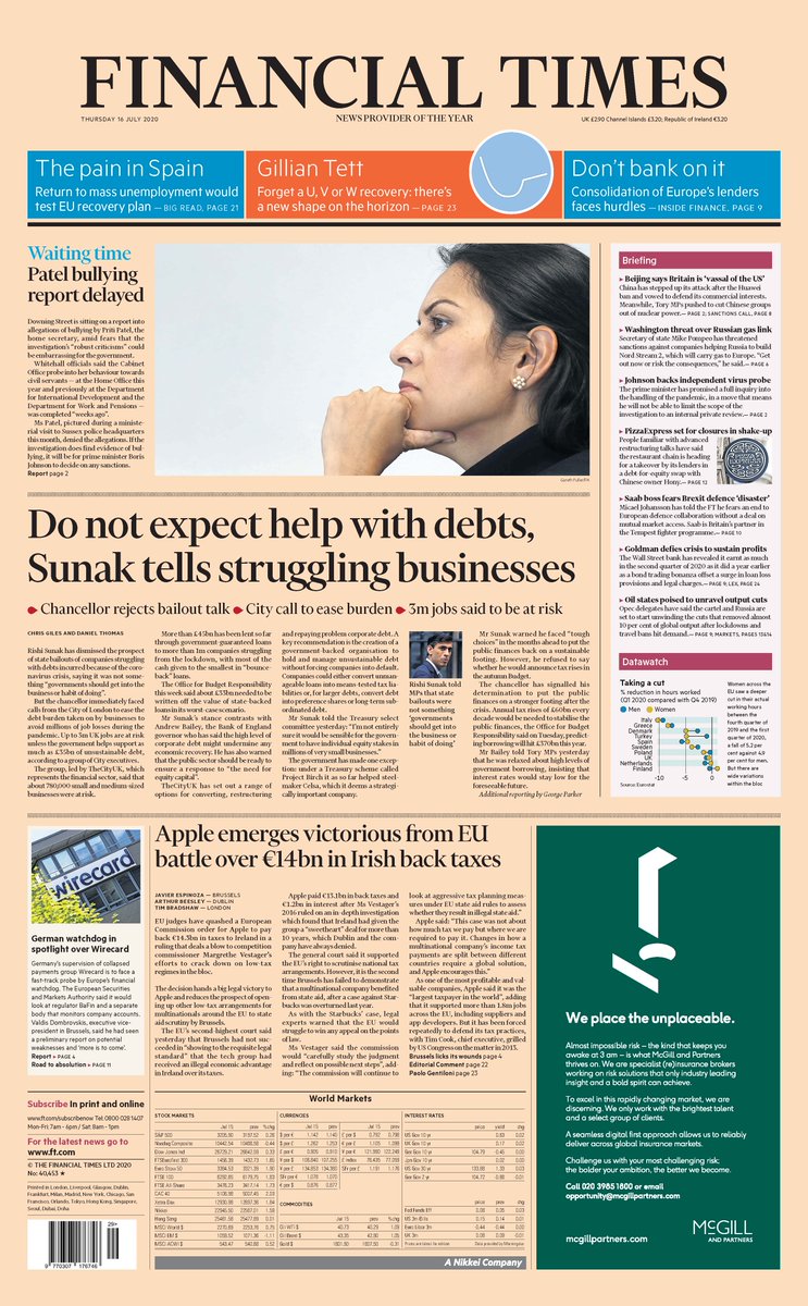 The Financial Times reports that Chancellor Rishi Sunak has dismissed the prospect of state bailouts of companies struggling with debts incurred because of the coronavirus crisis.