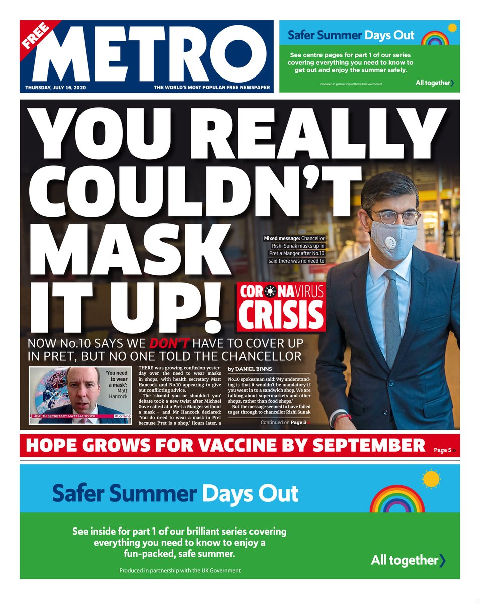Metro writes that there was growing confusion over the need to wear masks in shops, with Health Secretary Matt Hancock and Number 10 appearing to give out conflicting advice.