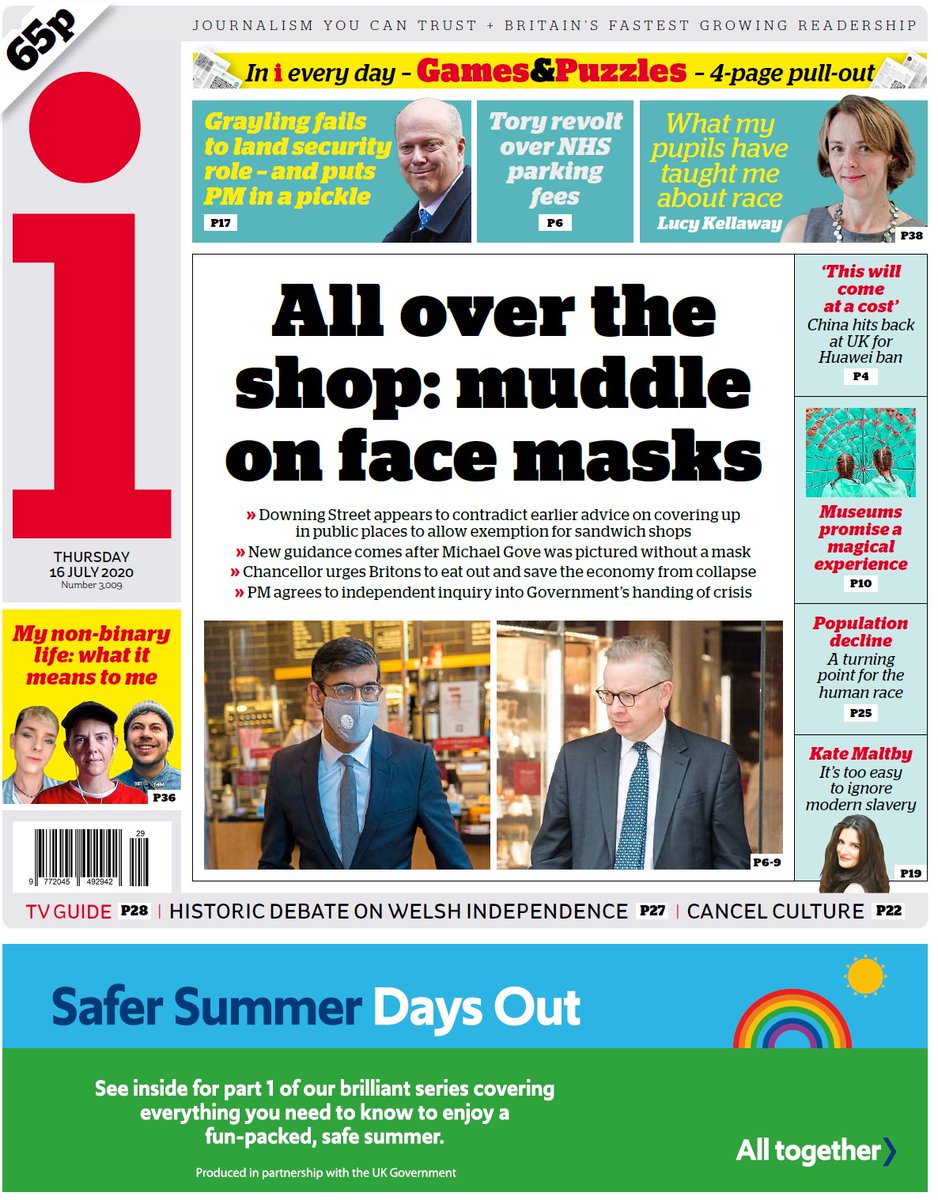 The i reports that Downing Street appears to contradict earlier advice on covering up in public places to allow exemptions for sandwich shops.